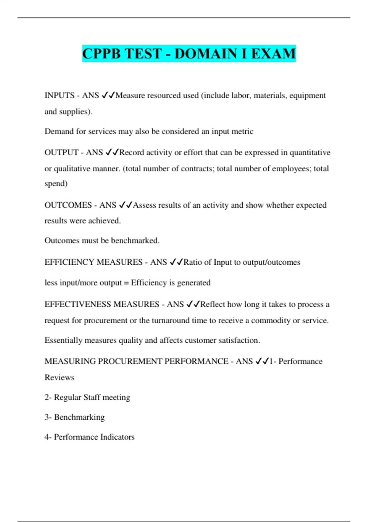 CPPB TEST - DOMAIN I EXAM INPUTS - ANS ️️ Measure resourced used (include labor, materials, equipment and supplies). Demand for services may also be considered an input metric OUTPUT - ANS ️️ Record activity or effort that can be expressed in quantitative or qualitative manner. (total number of contracts; total number of employees; total spend) OUTCOMES - ANS ️️ Assess results of an activity and show whether expected results were achieved. Outcomes must be benchmarked. EFFICIENCY MEASURES - ANS ️️ Ratio of Input to output/outcomes less input/more output = Efficiency is generated EFFECTIVENESS MEASURES - ANS ️️ Reflect how long it takes to process a request for procurement or the turnaround time to receive a commodity or service. Essentially measures quality and affects customer satisfaction. MEASURING PROCUREMENT PERFORMANCE - ANS ️️ 1- Performance Reviews 2- Regular Staff meeting 3- Benchmarking 4- Performance Indicators