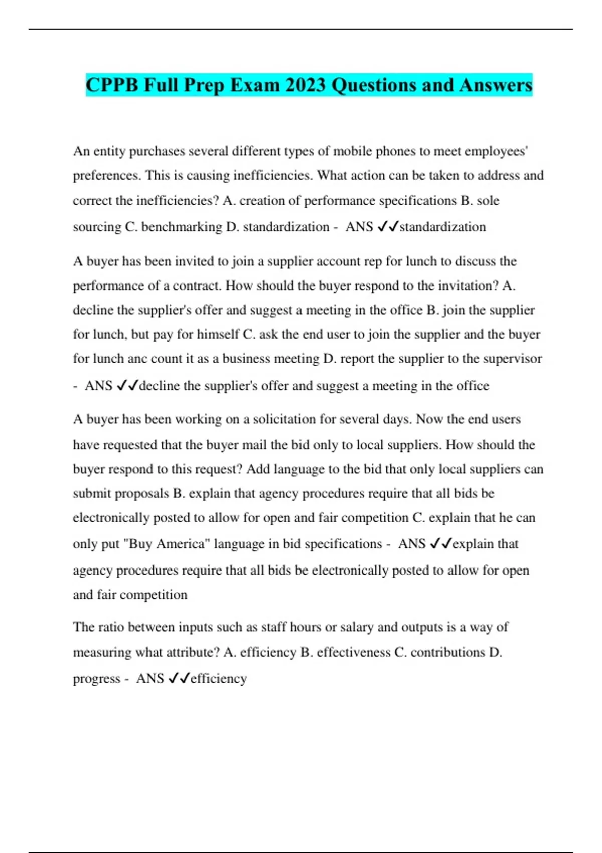 CPPB Full Prep Exam 2023 Questions and Answers An entity purchases several different types of mobile phones to meet employees' preferences. This is causing inefficiencies. What action can be taken to address and correct the inefficiencies? A. creation of performance specifications B. sole sourcing C. benchmarking D. standardization - ANS ️️ standardization A buyer has been invited to join a supplier account rep for lunch to discuss the performance of a contract. How should the buyer respond to the invitation? A. decline the supplier's offer and suggest a meeting in the office B. join the supplier for lunch, but pay for himself C. ask the end user to join the supplier and the buyer for lunch anc count it as a business meeting D. report the supplier to the supervisor - ANS ️️ decline the supplier's offer and suggest a meeting in the office A buyer has been working on a solicitation for several days. Now the end users have requested that the buyer mail the bid only to local suppliers. How should the buyer respond to this request? Add language to the bid that only local suppliers can submit proposals B. explain that agency procedures require that all bids be electronically posted to allow for open and fair competition C. explain that he can only put "Buy America" language in bid specifications - ANS ️️ explain that agency procedures require that all bids be electronically posted to allow for open and fair competition The ratio between inputs such as staff hours or salary and outputs is a way of measuring what attribute? A. efficiency B. effectiveness C. contributions D. progress - ANS ️️ efficiency