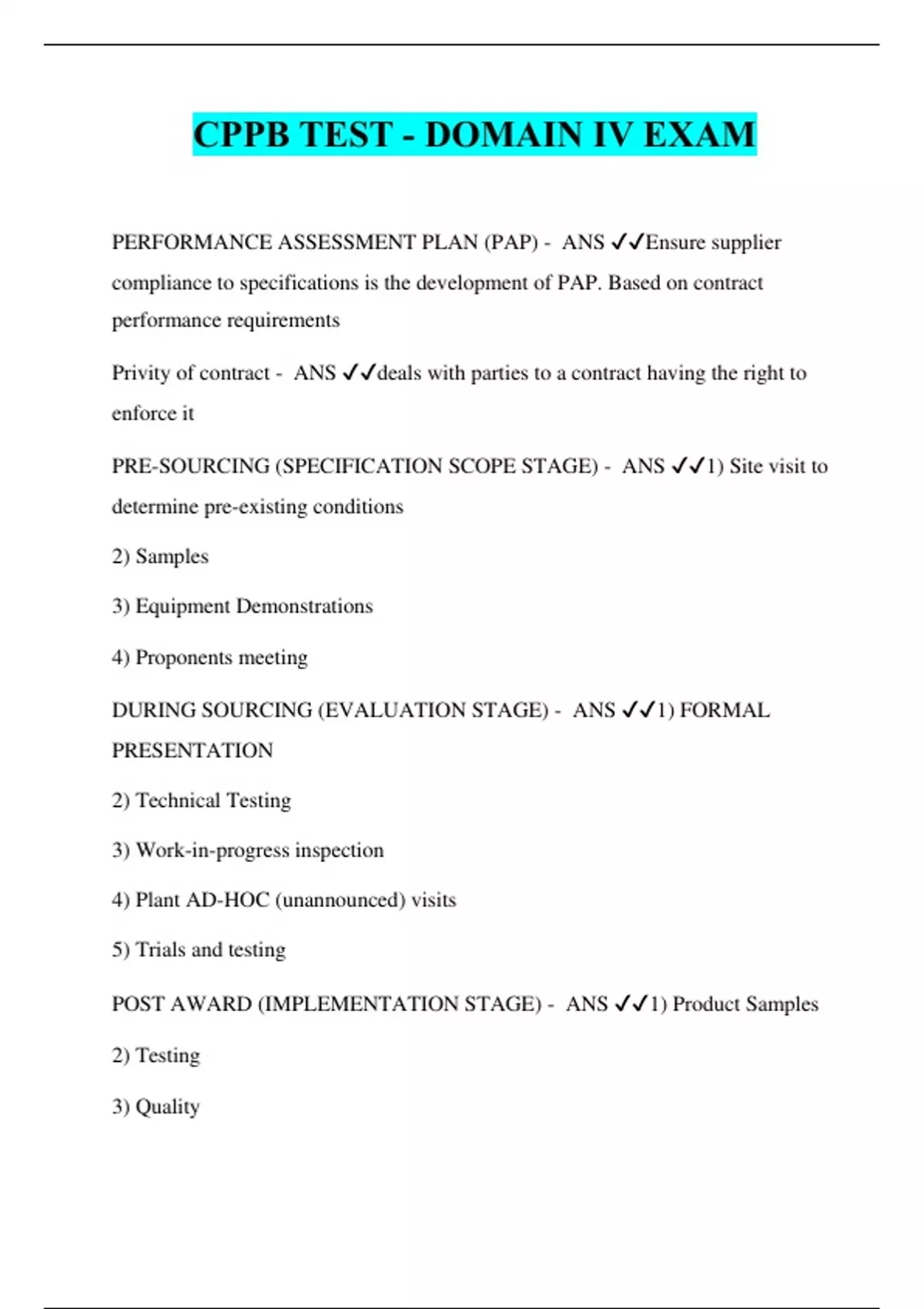 CPPB TEST - DOMAIN IV EXAM PERFORMANCE ASSESSMENT PLAN (PAP) - ANS ️️ Ensure supplier compliance to specifications is the development of PAP. Based on contract performance requirements Privity of contract - ANS ️️ deals with parties to a contract having the right to enforce it PRE-SOURCING (SPECIFICATION SCOPE STAGE) - ANS ️️ 1) Site visit to determine pre-existing conditions 2) Samples 3) Equipment Demonstrations 4) Proponents meeting DURING SOURCING (EVALUATION STAGE) - ANS ️️ 1) FORMAL PRESENTATION 2) Technical Testing 3) Work-in-progress inspection 4) Plant AD-HOC (unannounced) visits 5) Trials and testing POST AWARD (IMPLEMENTATION STAGE) - ANS ️️ 1) Product Samples 2) Testing 3) Quality
