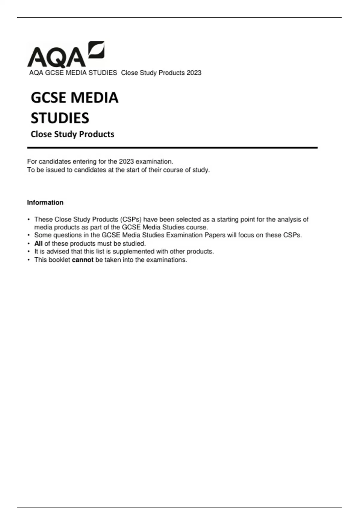 AQA GCSE MEDIA STUDIES Close Study Products 2023