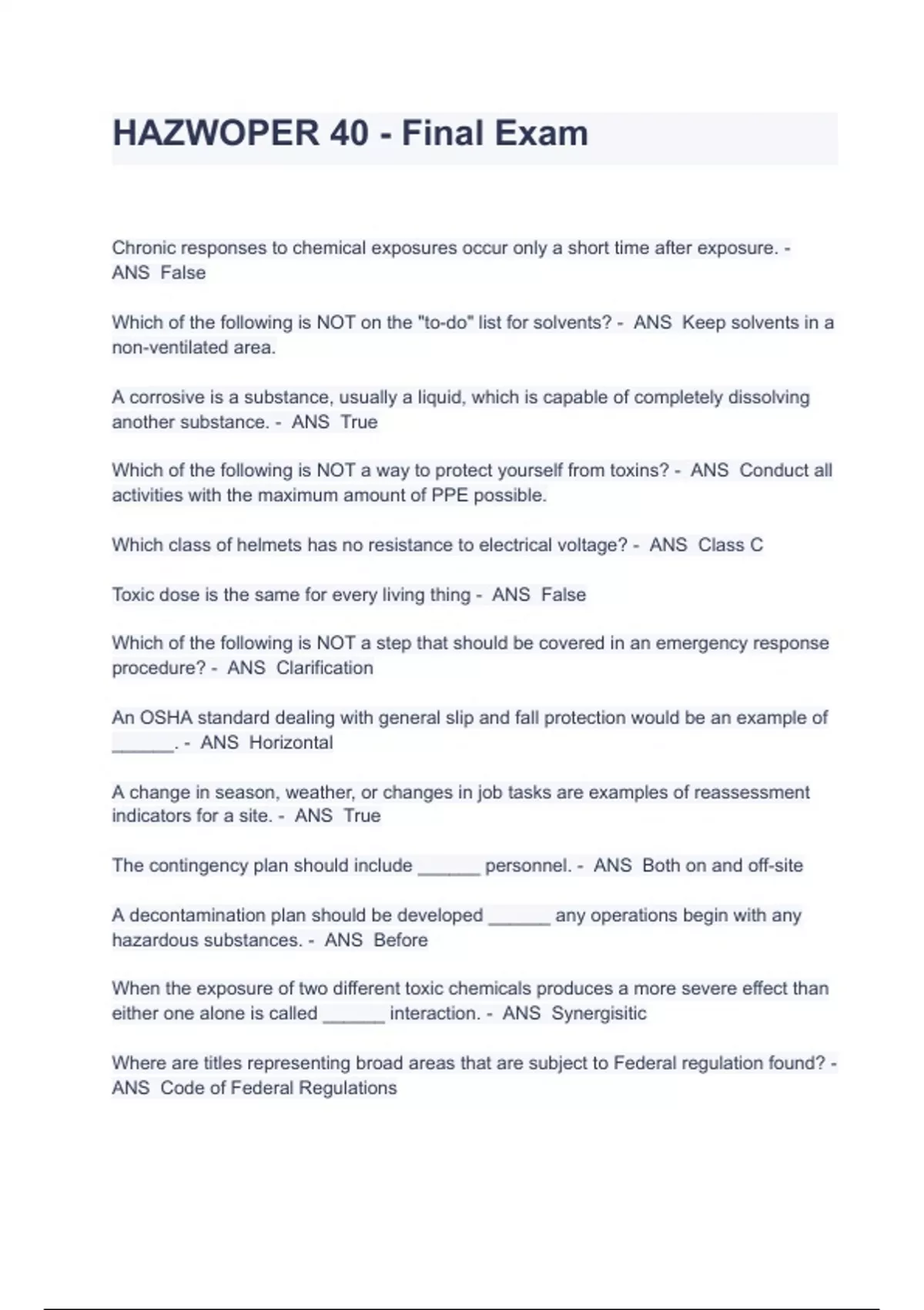 HAZWOPER 40 - Final Exam Questions And Answers Chronic responses to chemical exposures occur only a short time after exposure. - ANS False Which of the following is NOT on the "to-do" list for solvents? - ANS Keep solvents in a non-ventilated area. A corrosive is a substance, usually a liquid, which is capable of completely dissolving another substance. - ANS True Which of the following is NOT a way to protect yourself from toxins? - ANS Conduct all activities with the maximum amount of PPE possible. Which class of helmets has no resistance to electrical voltage? - ANS Class C Toxic dose is the same for every living thing - ANS False Which of the following is NOT a step that should be covered in an emergency response procedure? - ANS Clarification An OSHA standard dealing with general slip and fall protection would be an example of ______. - ANS Horizontal