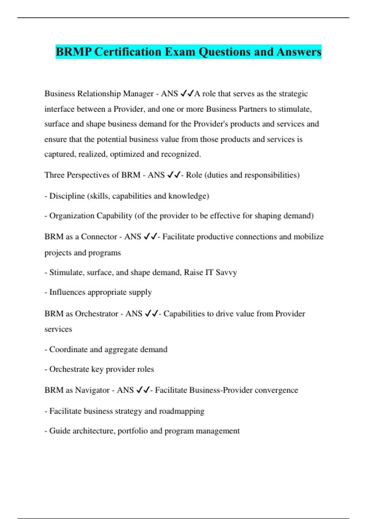 BRMP Certification Exam Questions and Answers Business Relationship Manager - ANS ️️ A role that serves as the strategic interface between a Provider, and one or more Business Partners to stimulate, surface and shape business demand for the Provider's products and services and ensure that the potential business value from those products and services is captured, realized, optimized and recognized. Three Perspectives of BRM - ANS ️️ - Role (duties and responsibilities) - Discipline (skills, capabilities and knowledge) - Organization Capability (of the provider to be effective for shaping demand) BRM as a Connector - ANS ️️ - Facilitate productive connections and mobilize projects and programs - Stimulate, surface, and shape demand, Raise IT Savvy - Influences appropriate supply BRM as Orchestrator - ANS ️️ - Capabilities to drive value from Provider services - Coordinate and aggregate demand - Orchestrate key provider roles BRM as Navigator - ANS ️️ - Facilitate Business-Provider convergence - Facilitate business strategy and roadmapping - Guide architecture, portfolio and program management
