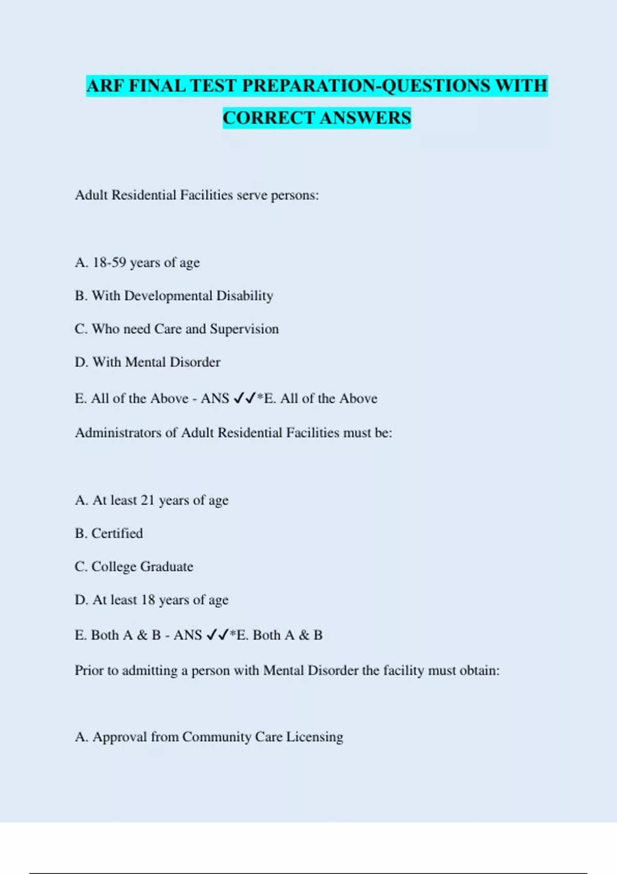 ARF FINAL TEST PREPARATION-QUESTIONS WITH CORRECT ANSWERS Adult Residential Facilities serve persons: A. 18-59 years of age B. With Developmental Disability C. Who need Care and Supervision D. With Mental Disorder E. All of the Above - ANS ️️ *E. All of the Above Administrators of Adult Residential Facilities must be: A. At least 21 years of age B. Certified C. College Graduate D. At least 18 years of age E. Both A & B - ANS ️️ *E. Both A & B Prior to admitting a person with Mental Disorder the facility must obtain: A. Approval from Community Care Licensing B. Mental Health Assessment C. Physician's Order D. All of the Above - ANS ️️ *D. All of the Above What must be included in every advertisement for the facility? A. Name of Licensee B. Capacity C. Facility License Number D. Address of facility E. All of the above - ANS ️️ *C. Facility License Number A room approved for ambulatory clients may be used by: A. ambulatory clients B. ambulatory or nonambulatory clients who rely on a walker C. ambulatory clients and nonambulatory clients in an emergency situation, not to exceed 5 working days D. ambulatory clients and clients who are transfer dependent - ANS ️️ *A. ambulatory clients What is included in the facility license applica