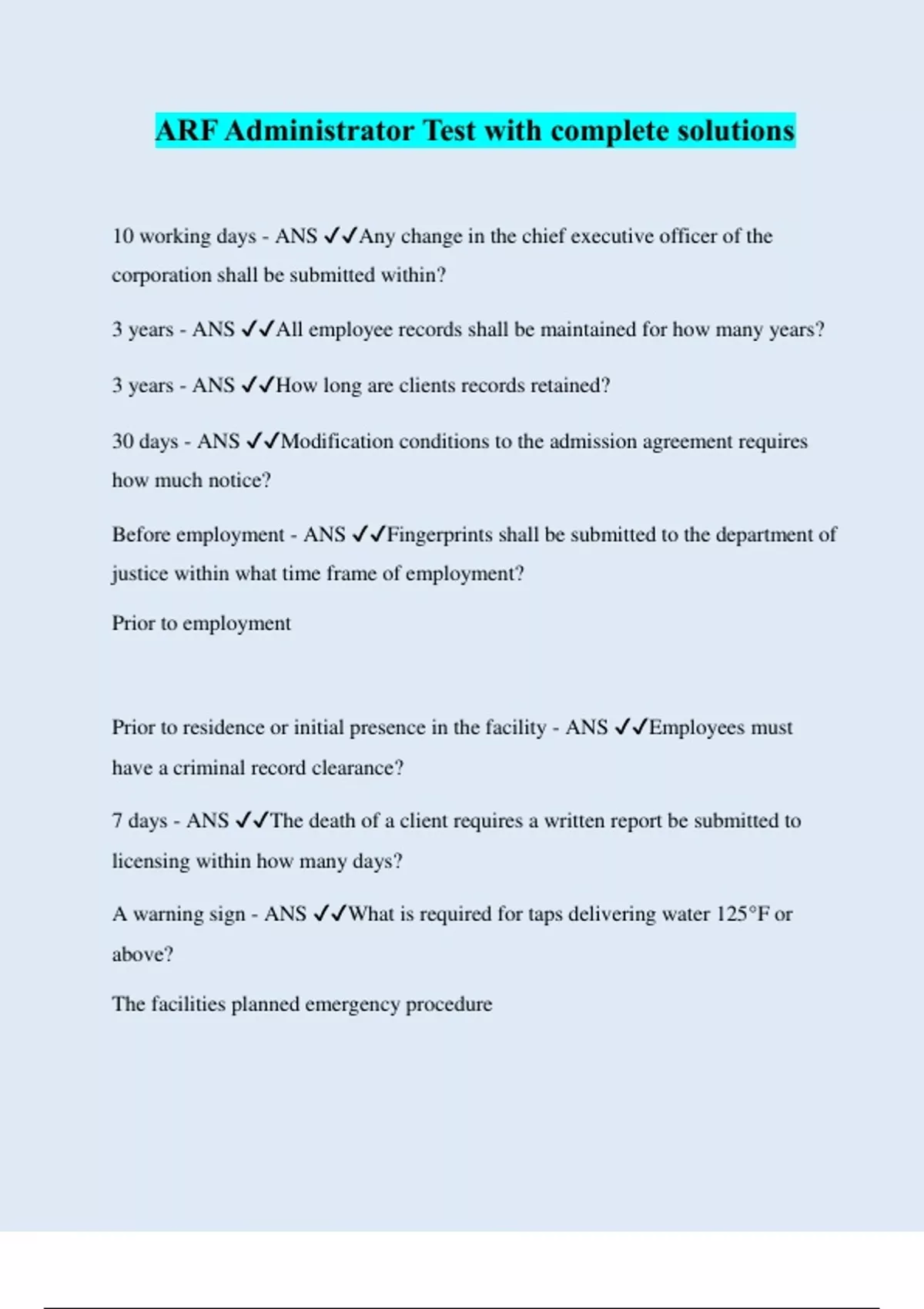 ARF Administrator Test with complete solutions 10 working days - ANS ️️ Any change in the chief executive officer of the corporation shall be submitted within? 3 years - ANS ️️ All employee records shall be maintained for how many years? 3 years - ANS ️️ How long are clients records retained? 30 days - ANS ️️ Modification conditions to the admission agreement requires how much notice? Before employment - ANS ️️ Fingerprints shall be submitted to the department of justice within what time frame of employment? Prior to employment Prior to residence or initial presence in the facility - ANS ️️ Employees must have a criminal record clearance? 7 days - ANS ️️ The death of a client requires a written report be submitted to licensing within how many days? A warning sign - ANS ️️ What is required for taps delivering water 125°F or above? The facilities planned emergency procedure