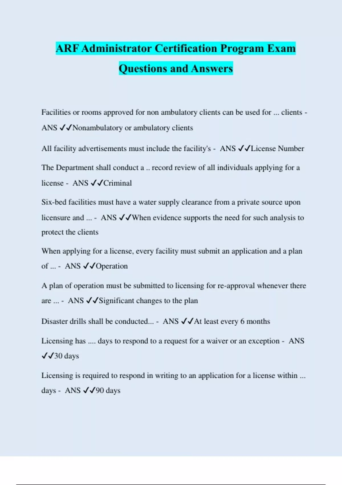 ARF Administrator Certification Program with Complete Solutions Facilities or rooms approved for non ambulatory clients can be used for ... clients - ANS ️️ Nonambulatory or ambulatory clients All facility advertisements must include the facility's - ANS ️️ License Number The Department shall conduct a .. record review of all individuals applying for a license - ANS ️️ Criminal Six-bed facilities must have a water supply clearance from a private source upon licensure and ... - ANS ️️ When evidence supports the need for such analysis to protect the clients When applying for a license, every facility must submit an application and a plan of ... - ANS ️️ Operation A plan of operation must be submitted to licensing for re-approval whenever there are ... - ANS ️️ Significant changes to the plan Disaster drills shall be conducted... - ANS ️️ At least every 6 months Licensing has .... days to respond to a request for a waiver or an exception - ANS ️️ 30 days Licensing is required to respond in writing to an application for a license within ... days - ANS ️️ 90 days