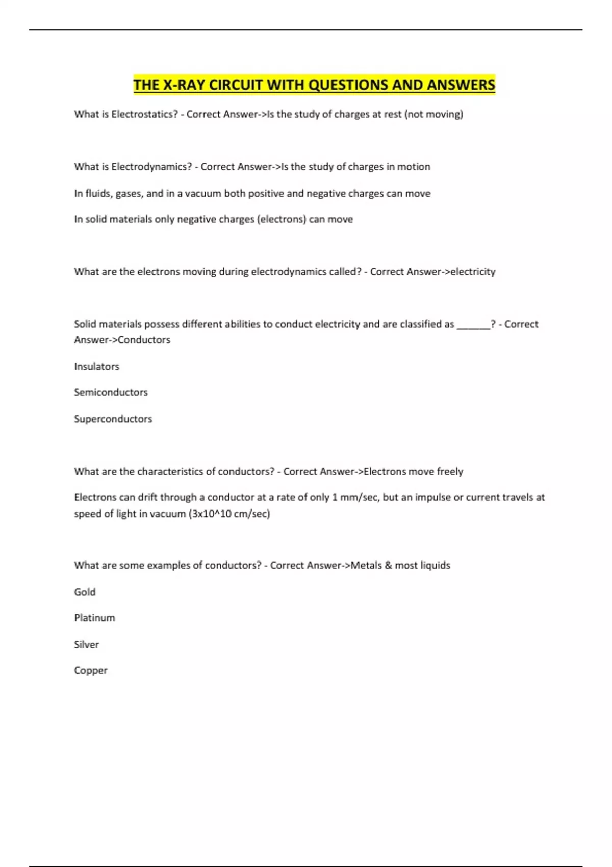 THE X-RAY CIRCUIT WITH QUESTIONS AND ANSWERS What is Electrostatics? - Correct Answer->Is the study of charges at rest (not moving) What is Electrodynamics? - Correct Answer->Is the study of charges in motion In fluids, gases, and in a vacuum both positive and negative charges can move In solid materials only negative charges (electrons) can move What are the electrons moving during electrodynamics called? - Correct Answer->electricity Solid materials possess different abilities to conduct electricity and are classified as ______? - Correct Answer->Conductors Insulators Semiconductors Superconductors What are the characteristics of conductors? - Correct Answer->Electrons move freely Electrons can drift through a conductor at a rate of only 1 mm/sec, but an impulse or current travels at speed of light in vacuum (3x10^10 cm/sec) What are some examples of conductors? - Correct Answer->Metals & most liquids Gold Platinum Silver Copper The study of stationary electric charges is A. electromagnetism B. electrodynamics C. electronics D. electrostatics - Correct Answer->D. electrostatics What is the power source? - Correct Answer->Source of electrons (electricity) What are the symbols for power source? - Correct Answer->Alternating Current (wall outlet) or AC Direct Current (DC) a battery Capacitor (DC) What is a switch? - Correct Answer->Turns circuit on and off What is a resistor? - Correct Answer- CONTINUES...