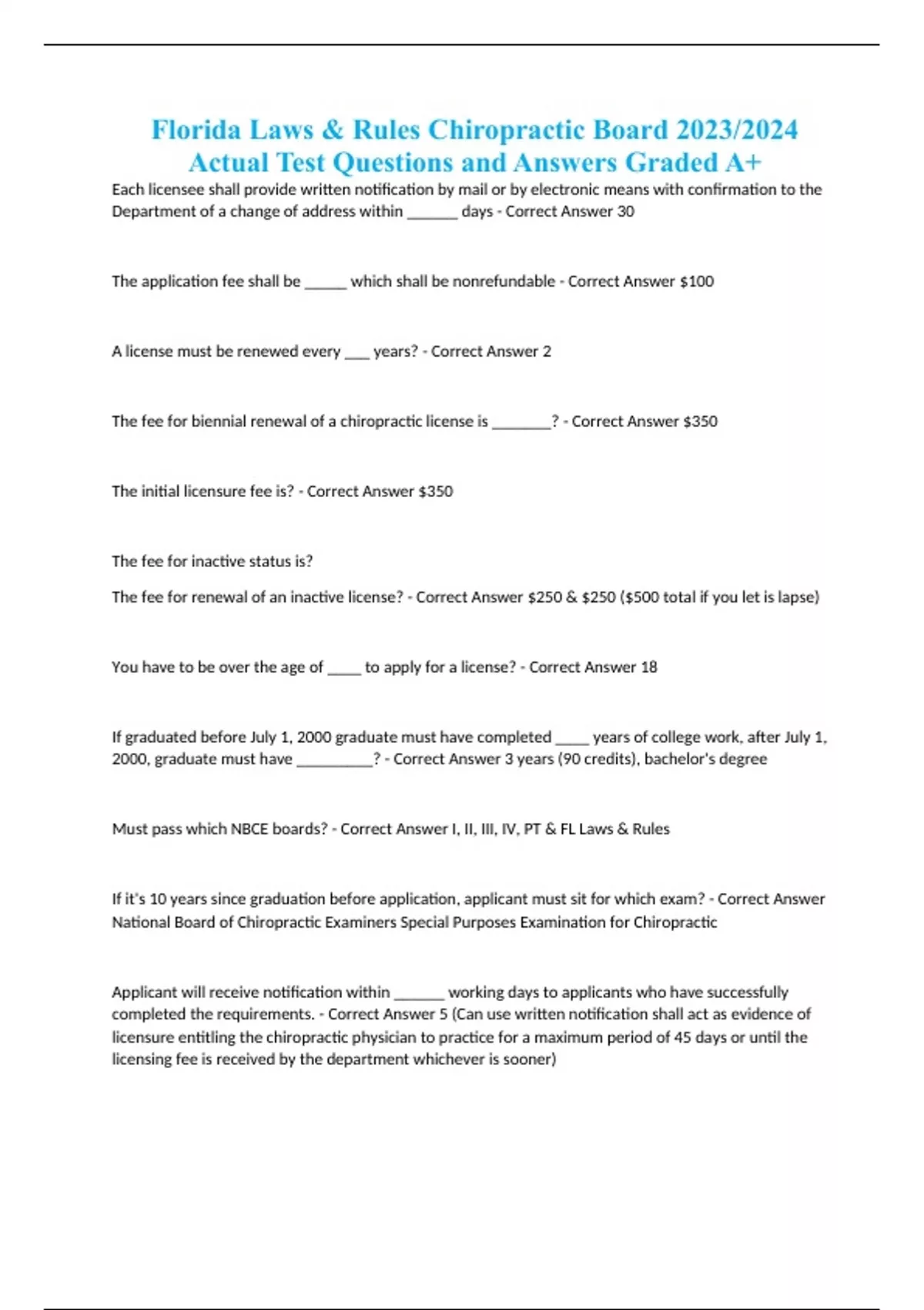 Florida Laws & Rules Chiropractic Board 2023/2024 Actual Test Questions and Answers Graded A+ Each licensee shall provide written notification by mail or by electronic means with confirmation to the Department of a change of address within ______ days - Correct Answer 30 The application fee shall be _____ which shall be nonrefundable - Correct Answer $100 A license must be renewed every ___ years? - Correct Answer 2 The fee for biennial renewal of a chiropractic license is _______? - Correct Answer $350 The initial licensure fee is? - Correct Answer $350 The fee for inactive status is? The fee for renewal of an inactive license? - Correct Answer $250 & $250 ($500 total if you let is lapse) You have to be over the age of ____ to apply for a license? - Correct Answer 18 If graduated before July 1, 2000 graduate must have completed ____ years of college work, after July 1, 2000, graduate must have _________? - Correct Answer 3 years (90 credits), bachelor's degree Must pass which NBCE boards? - Correct Answer I, II, III, IV, PT & FL Laws & Rules If it's 10 years since graduation before application, applicant must sit for which exam? - Correct Answer National Board of Chiropractic Examiners Special Purposes Examination for Chiropractic Applicant will receive notification within ______ working days to applicants who have successfully completed the requirements. - Correct Answer 5 (Can use written notification shall act as evidence of licensure entitling the chiropractic physician to practice for a maximum period of 45 days or until the licensing fee is received by the department whichever is sooner