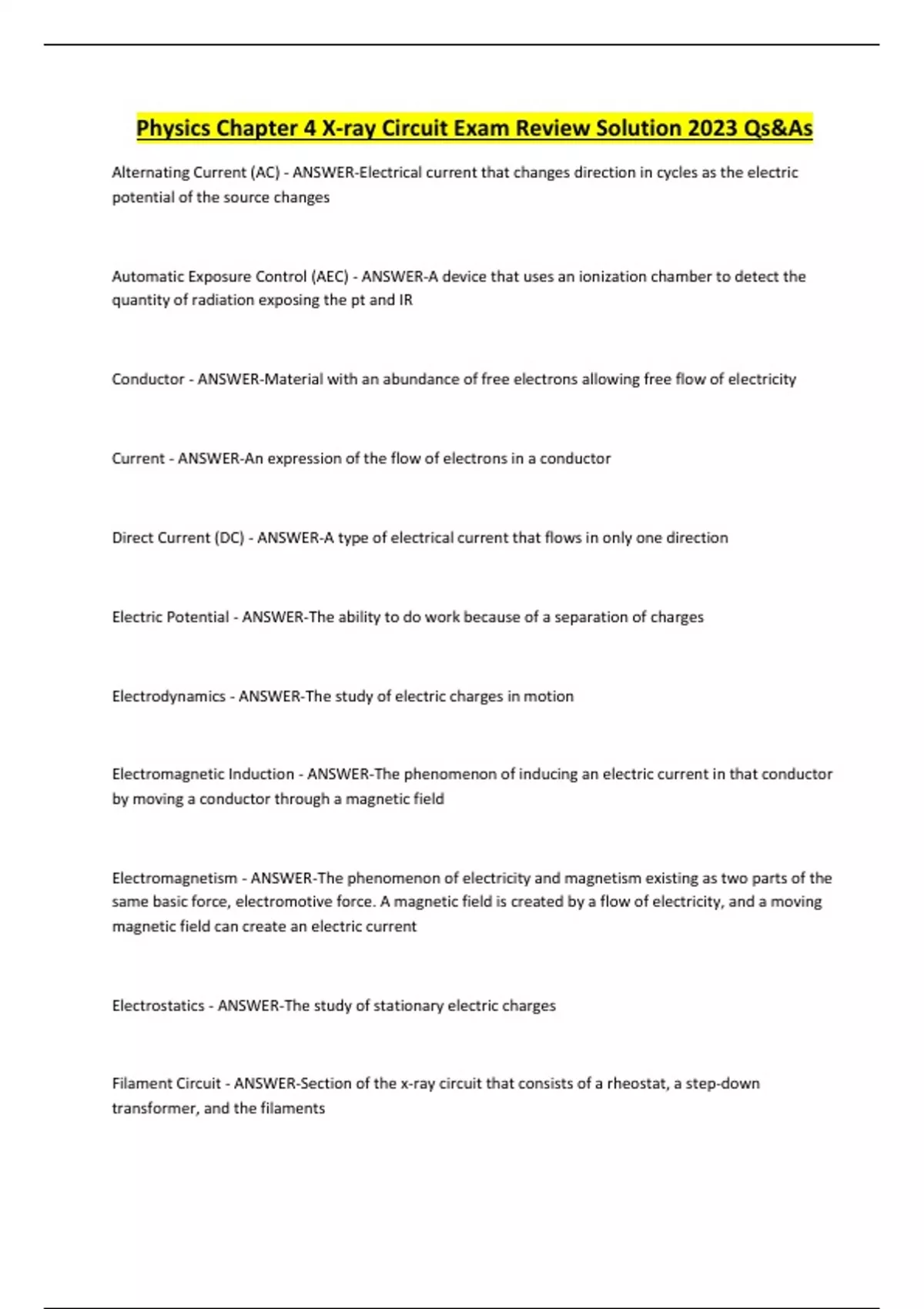 Physics Chapter 4 X-ray Circuit Exam Review Solution 2023 Qs&As Alternating Current (AC) - ANSWER-Electrical current that changes direction in cycles as the electric potential of the source changes Automatic Exposure Control (AEC) - ANSWER-A device that uses an ionization chamber to detect the quantity of radiation exposing the pt and IR Conductor - ANSWER-Material with an abundance of free electrons allowing free flow of electricity Current - ANSWER-An expression of the flow of electrons in a conductor Direct Current (DC) - ANSWER-A type of electrical current that flows in only one direction Electric Potential - ANSWER-The ability to do work because of a separation of charges Electrodynamics - ANSWER-The study of electric charges in motion Electromagnetic Induction - ANSWER-The phenomenon of inducing an electric current in that conductor by moving a conductor through a magnetic field Electromagnetism - ANSWER-The phenomenon of electricity and magnetism existing as two parts of the same basic force, electromotive force. A magnetic field is created by a flow of electricity, and a moving magnetic field can create an electric current Electrostatics - ANSWER-The study of stationary electric charges Filament Circuit - ANSWER-Section of the x-ray circuit that consists of a rheostat, a step-down transformer, and the filaments Generators - ANSWER-Device that converts some form of mechanical energy into electrical energy Grounding - ANSWER-A protective measure to neutralize an electric charge; also a process of connecting the electrical device to the earth via a conductor Insulator - ANSWER-Material with very few free electrons prohibiting the flow of electricity Magnetism - ANSWER-T... The smallest units of charge exist with the ____________________ and ______________________ - ANSWER-electron proton Units of measure for electrical charge - ANSWER-Coulomb Electricity most often results from the movement of ______________________ - ANSWER-electrons Describe the movement of protons inside the nucleus of the atom: - ANSWER-They are relatively fixed in their position. Describe the movement of electrons in an atom: - ANSWER-They are free to move about depending on the material. _______________ and _________________have very large number of free electrons in outer shell therefore they are good conductors - ANSWER-copper and gold _______________ and _________________ have very few free electrons in outer shell therefore they are good insulators - ANSWER-glass and plastic 5 general principles of electrostatics: - ANSWER-Law of Repulsion and Attraction, Inverse Square Law, Distribution, Concentration, and Movement Which general principle of electrostatics states that like charges repel and unlike charges attract? - CONTINUES...