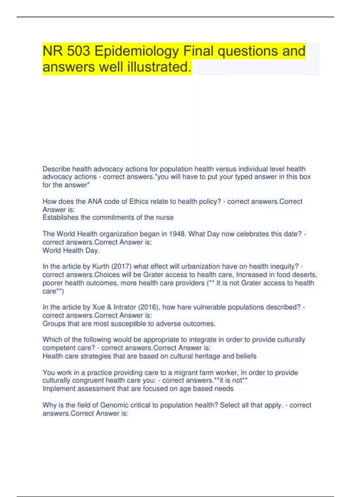 NR 503 Epidemiology Final questions and answers well illustrated. Describe health advocacy actions for population health versus individual level health advocacy actions - correct answers."you will have to put your typed answer in this box for the answer" How does the ANA code of Ethics relate to health policy? - correct answers.Correct Answer is: Establishes the commitments of the nurse The World Health organization began in 1948. What Day now celebrates this date? - correct answers.Correct Answer is: World Health Day. In the article by Kurth (2017) what effect will urbanization have on health inequity? - correct answers.Choices will be Grater access to health care, Increased in food deserts, poorer health outcomes, more health care providers (** It is not Grater access to health care**) In the article by Xue & Intrator (2016), how hare vulnerable populations described? - correct answers.Correct Answer is: Groups that are most susceptible to adverse outcomes. Which of the following would be appropriate to integrate in order to provide culturally competent care? - correct answers.Correct Answer is: Health care strategies that are based on cultural heritage and beliefs You work in a practice providing care to a migrant farm worker, In order to provide culturally congruent health care you: - correct answers.**it is not** Implement assessment that are focused on age based needs Why is the field of Genomic critical to population health? Select all that apply. - correct answers.Correct Answer is: