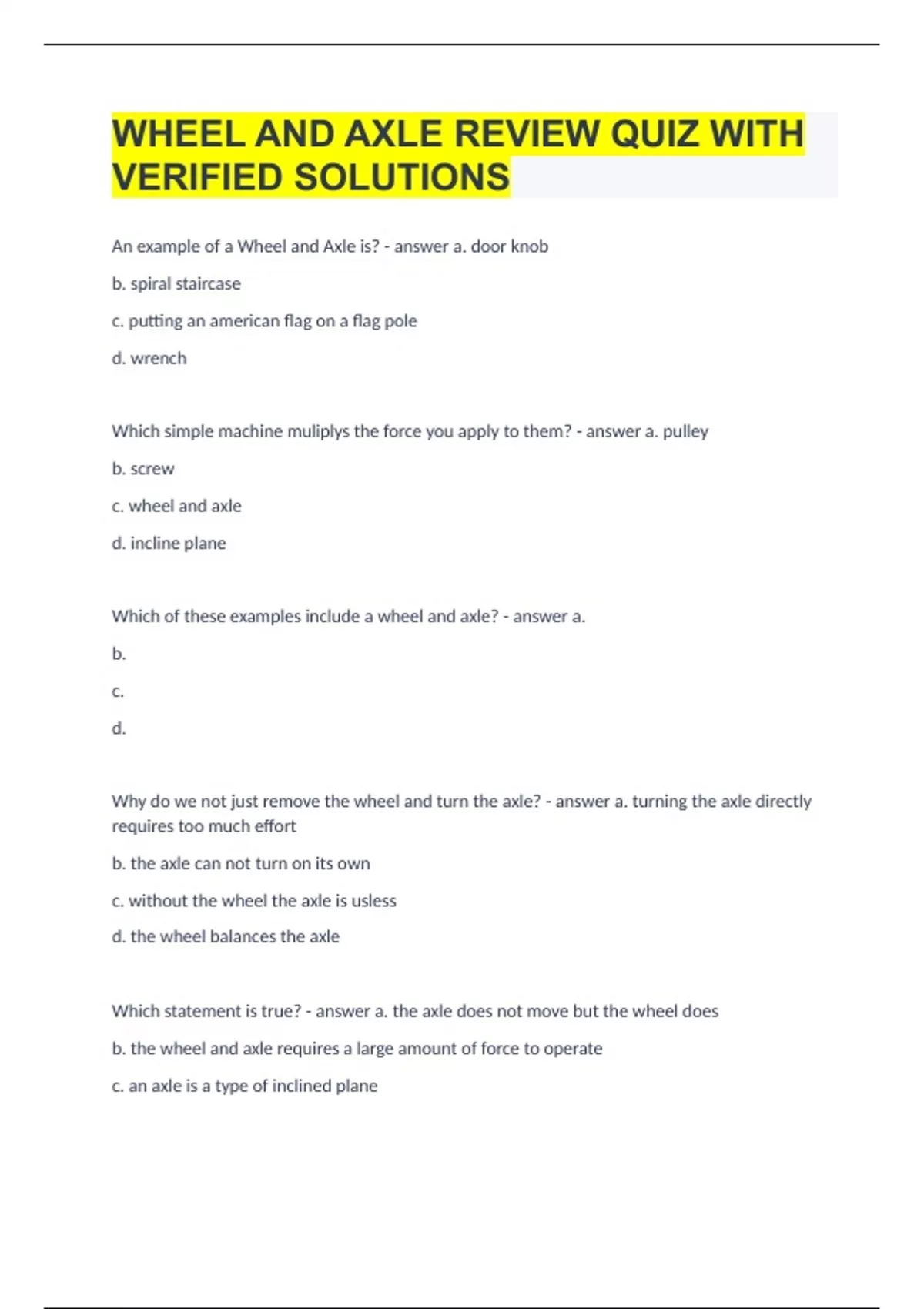 WHEEL AND AXLE REVIEW QUIZ WITH VERIFIED SOLUTIONS.