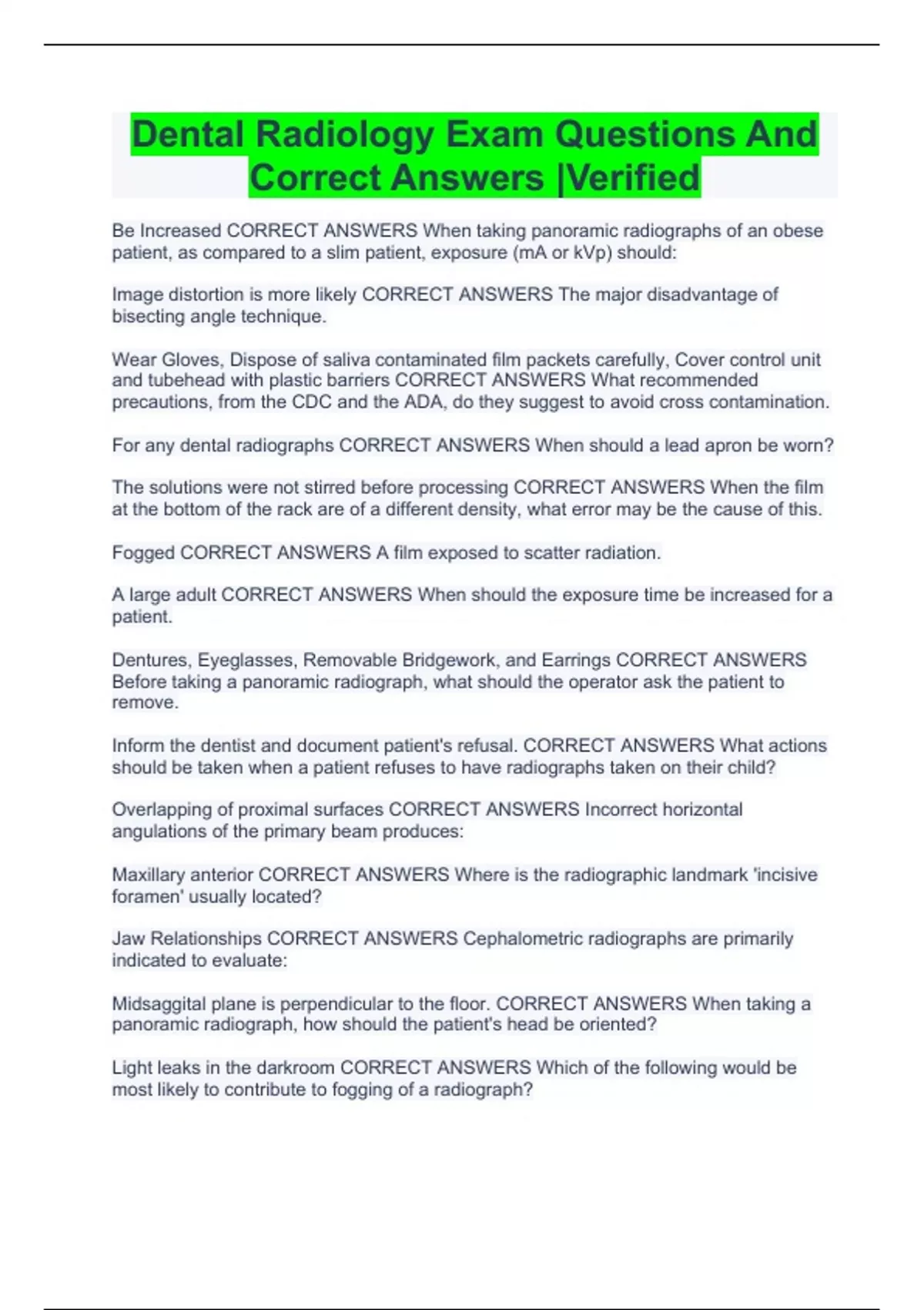 Dental Radiology Exam Questions And Correct Answers |Verified