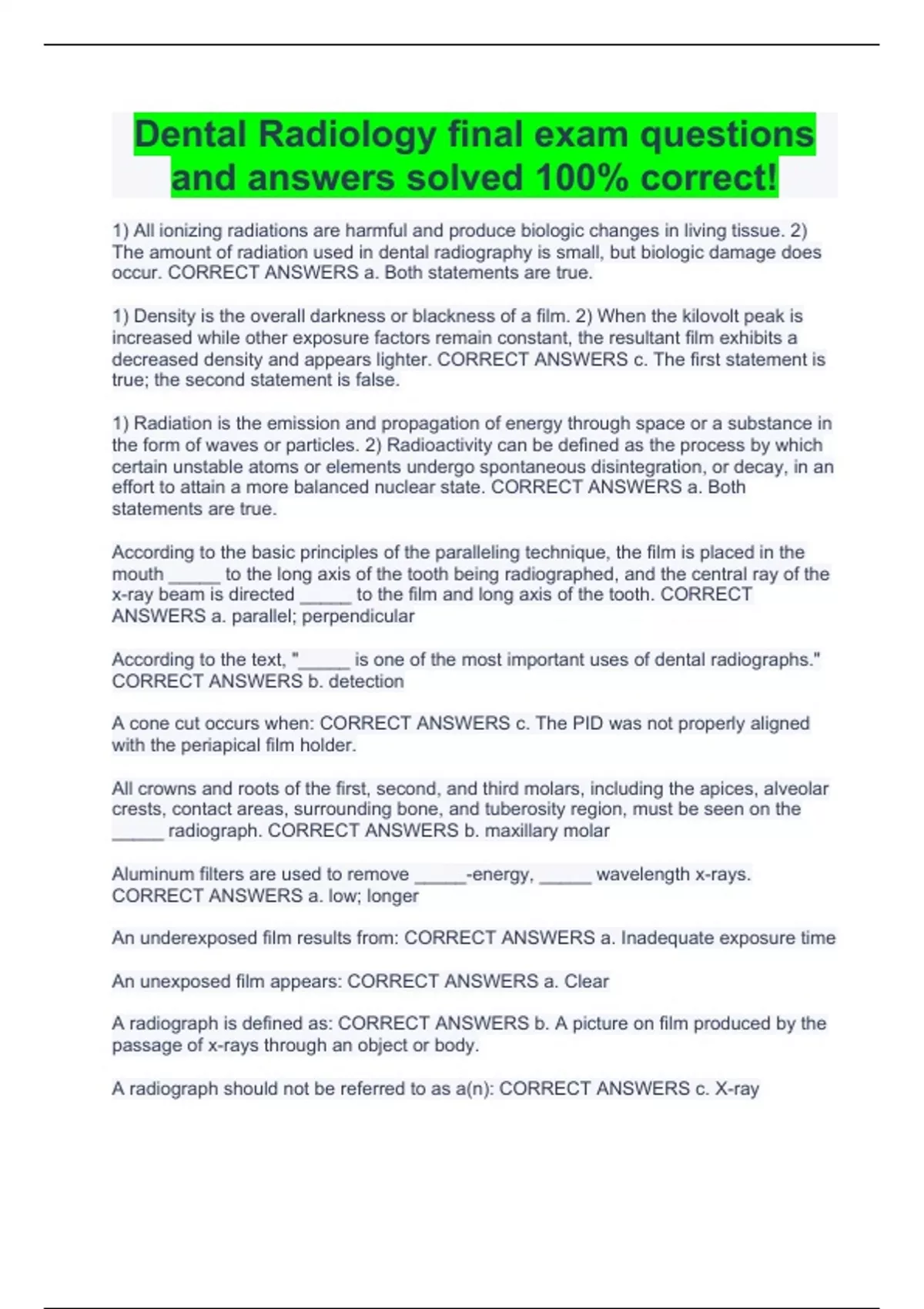 Dental Radiology final exam questions and answers solved 100% correct!