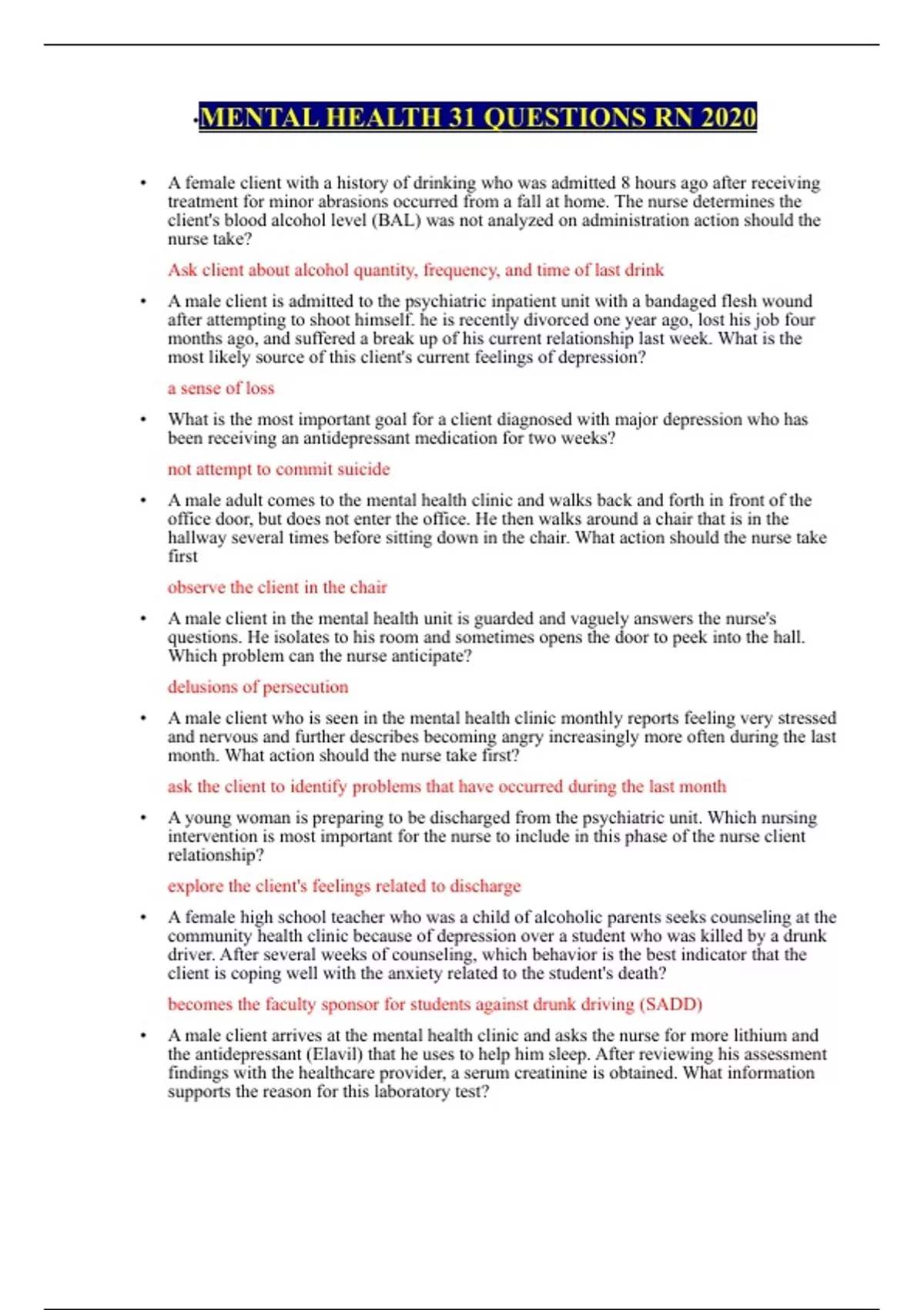 MENTAL HEALTH 31 QUESTIONS RN 2020