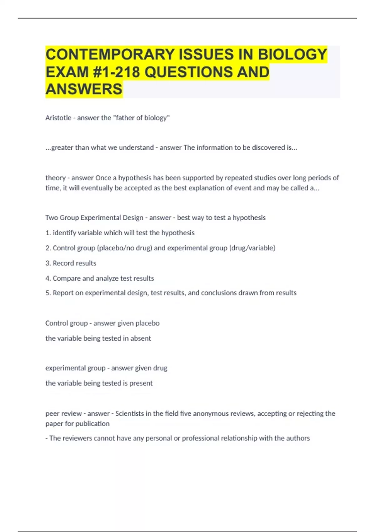 CONTEMPORARY ISSUES IN BIOLOGY EXAM #1-218 QUESTIONS AND ANSWERS.