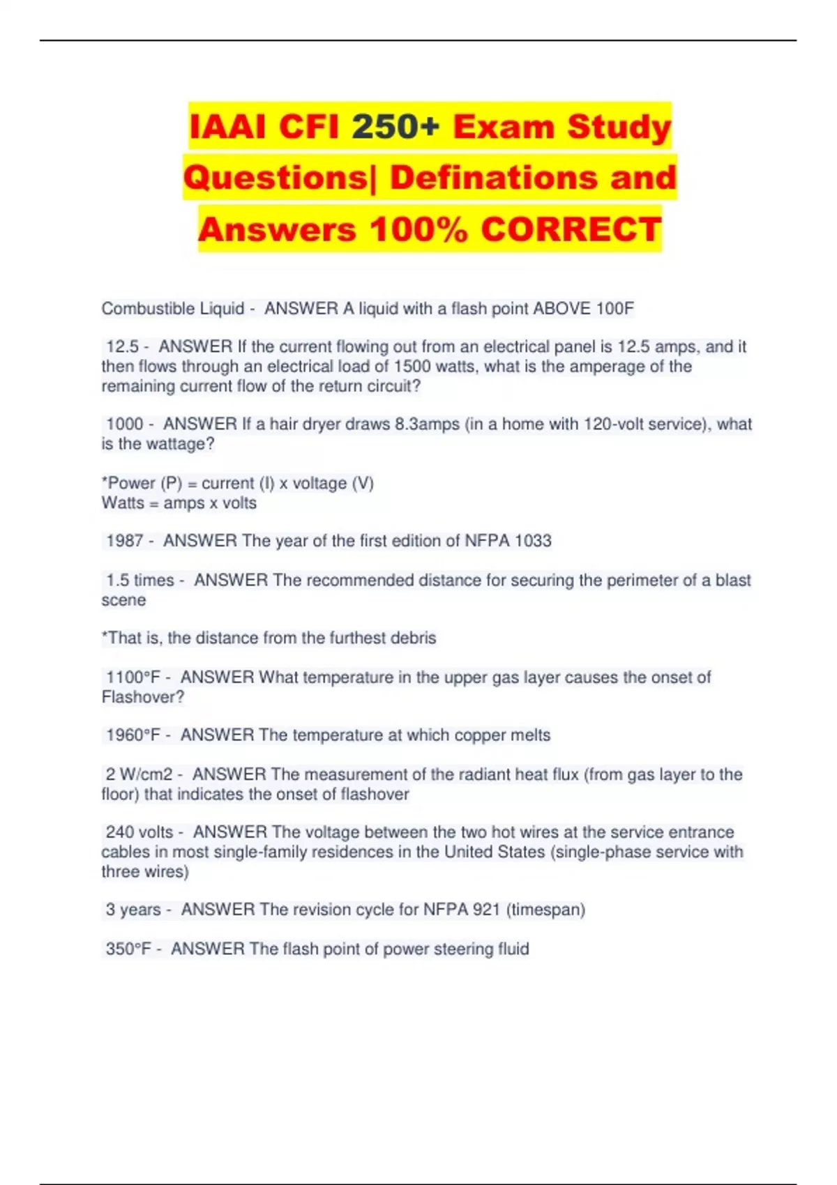 IAAI CFI 250+ Exam Study Questions| Definations and Answers 100% CORRECT Combustible Liquid - ANSWER A liquid with a flash point ABOVE 100F 12.5 - ANSWER If the current flowing out from an electrical panel is 12.5 amps, and it then flows through an electrical load of 1500 watts, what is the amperage of the remaining current flow of the return circuit? 1000 - ANSWER If a hair dryer draws 8.3amps (in a home with 120-volt service), what is the wattage? *Power (P) = current (I) x voltage (V) Watts = amps x volts 1987 - ANSWER The year of the first edition of NFPA 1033 1.5 times - ANSWER The recommended distance for securing the perimeter of a blast scene *That is, the distance from the furthest debris 1100°F - ANSWER What temperature in the upper gas layer causes the onset of Flashover? 1960°F - ANSWER The temperature at which copper melts 2 W/cm2 - ANSWER The measurement of the radiant heat flux (from gas layer to the floor) that indicates the onset of flashover 240 volts - ANSWER The voltage between the two hot wires at the service entrance cables in most single-family residences in the United States (single-phase service with three wires) 3 years - ANSWER The revision cycle for NFPA 921 (timespan) 350°F - ANSWER The flash point of power steering fluid 35-70 p.s.i. - ANSWER In high-pressure fuel-injected vehicles, this is the typical range of pressure that is used to pump fuel from a fuel tank 5 and 17 - ANSWER The lower explosive and upper explosive limit of natural gas (methane)? 680°F - ANSWER The ignition temperature of power steering fluid Fuel - ANSWER Any substance that can undergo combustion Act or Omission - ANSWER Two factors or situations leading to a fire that may show the nature of the incident responsibility. Additional Investigative Recommendations - ANSWER This concept should not be included in a summary report of findings. Admiralty Law - ANSWER A law that may govern the fire investigation of a boat After-market Equipment - ANSWER A type of device in a vehicle, which can cause an electrical overload to factory installed wiring Alive and Breathing - ANSWER Evidence of smoke or soot in the lungs, bronchi, and trachea is one of the most significant factors in confirming that, at the time of the fire, the victim was WHAT? All Team Members - ANSWER Those who have the responsibility for monitoring safety conditions at the fire or explosion scene 1220°F - ANSWER The melting temperature of aluminum Aluminum-to-pavement sparks - ANSWER Which one of these is NOT considered a competent ignition source? Metal-to-metal sparks, Aluminum-to-pavement sparks, Metal-to-pavement sparks, Motor bearing sparks Heat Release Rate - ANSWER A meaningful analysis of a fire requires an understanding of the fire growth, the total heat released, and WHAT?