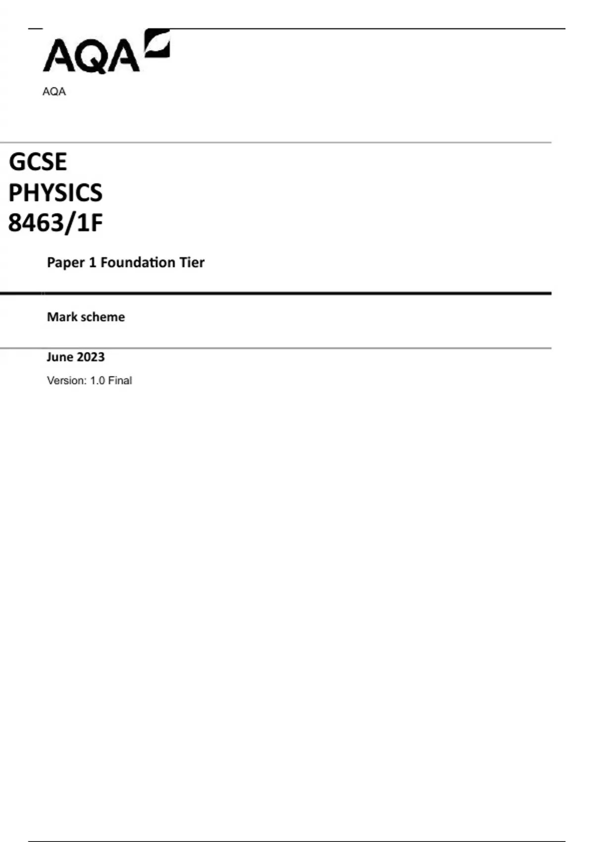 AQA GCSE PHYSICS 8463/1F Paper 1 Foundation Tier Mark scheme June 2023 Version: 1.0 Final