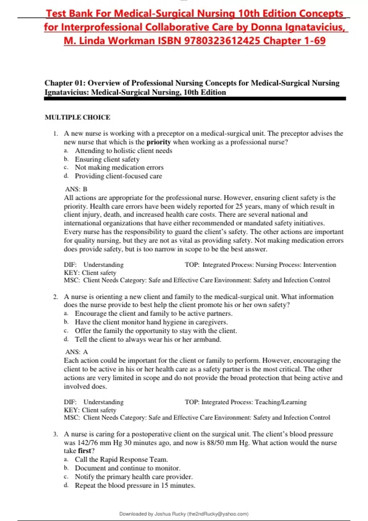 Test Bank For Medical-Surgical Nursing 10th Edition Concepts for Interprofessional Collaborative Care by Donna Ignatavicius, M. Linda Workman ISBN 9780323612425 Chapter 1-69 Chapter 01: Overview of Professional Nursing Concepts for Medical-Surgical Nursing Ignatavicius: Medical-Surgical Nursing, 10th Edition MULTIPLE CHOICE 1. A new nurse is working with a preceptor on a medical-surgical unit. The preceptor advises the new nurse that which is the priority when working as a professional nurse? a. Attending to holistic client needs b. Ensuring client safety c. Not making medication errors d. Providing client-focused care ANS: B All actions are appropriate for the professional nurse. However, ensuring client safety is the priority. Health care errors have been widely reported for 25 years, many of which result in client injury, death, and increased health care costs. There are several national and international organizations that have either recommended or mandated safety initiatives. Every nurse has the responsibility to guard the client’s safety. The other actions are important for quality nursing, but they are not as vital as providing safety. Not making medication errors does provide safety, but is too narrow in scope to be the best answer. DIF: Understanding TOP: Integrated Process: Nursing Process: Intervention KEY: Client safety MSC: Client Needs Category: Safe and Effective Care Environment: Safety and Infection Control 2. A nurse is orienting a new client and family to the medical-surgical unit. What information does the nurse provide to best help the client promote his or her own safety? a. Encourage the client and family to be active partners. b. Have the client monitor hand hygiene in caregivers. c. Offer the family the opportunity to stay with the client. d. Tell the client to always wear his or her armband. ANS: A Each action could be important for the client or family to perform. However, encouraging the client to be active in his or her health care as a safety partner is the most critical. The other actions are very limited in scope and do not provide the broad protection that being active and involved does. DIF: Understanding TOP: Integrated Process: Teaching/Learning KEY: Client safety MSC: Client Needs Category: Safe and Effective Care Environment: Safety and Infection Control 3. A nurse is caring for a postoperative client on the surgical unit. The client’s blood pressure was 142/76 mm Hg 30 minutes ago, and now is 88/50 mm Hg. What action would the nurse take first? a. Call the Rapid Response Team. b. Document and continue to monitor. c. Notify the primary health care provider. d. Repeat the blood pressure in 15 minutes. lOMoAR cPSD| B Downloaded by Joshua Rucky () ANS: A The purpose of the Rapid Response Team (RRT) is to intervene when clients are deteriorating before they suffer either respiratory or cardiac arrest. Since the client has manifested a significant change, the nurse would call the RRT. Changes in blood pressure, mental status, heart rate, temperature, oxygen saturation, and last 2 hours’ urine output are particularly significant and are part of the Modified Early Warning System guide. Documentation is vital, but the nurse must do more than document. The primary health care provider would be notified, but this is not more important than calling the RRT. The client’s blood pressure would be reassessed frequently, but the priority is getting the rapid care to the client. DIF: Applying TOP: Integrated Process: Communication and Documentation KEY: Rapid Response Team (RRT), Clinical judgment MSC: Client Needs Category: Physiological Integrity: Physiological Adaptation 4. A nurse wishes to provide client-centered care in all interactions. Which action by the nurse best demonstrates this concept? a. Assesses for cultural influences affecting health care. b. Ensures that all the client’s basic needs are met. c. Tells the client and family about all upcoming tests. d. Thoroughly orients the client and family to the room. ANS: A Showing respect for the client and family’s preferences and needs is essential to ensure a holistic or “whole-person” approach to care. By assessing the effect of the client’s culture on health care, this nurse is practicing client-focused care. Providing for basic needs does not demonstrate this competence. Simply telling the client about all upcoming tests is not providing empowering education. Orienting the client and family to the room is an important safety measure, but not directly related to demonstrating client-centered care. DIF: Understanding TOP: Integrated Process: Culture and Spirituality KEY: Client-centered care, Culture MSC: Client Needs Category: Psychosocial Integrity 5. A client is going to be admitted for a scheduled surgical procedure. Which action does the nurse explain is the most important thing the client can do to protect against errors? a. Bring a list of all medications and what they are for. b. Keep the provider’s phone number by the telephone. c. Make sure that all providers wash hands before entering the room. d. Write down the name of each caregiver who comes in the room. ANS: A Medication reconciliation is a formal process in which the client’s actual current medications are compared to the prescribed medications at the time of admission, transfer, or discharge. This National client Safety Goal is important to reduce medication errors. The client would not have to be responsible for providers washing their hands, and even if the client does so, this is too narrow to be the most important action to prevent errors. Keeping the provider’s phone number nearby and documenting everyone who enters the room also do not guarantee safety. DIF: Applying TOP: Integrated Process: Teaching/Learning KEY: Client safety, Informatics MSC: Client Needs Category: Safe and Effective Care Environment: Safety and Infection Control lOMoAR cPSD| B Downloaded by Joshua Rucky () 6. Which action by the nurse wor