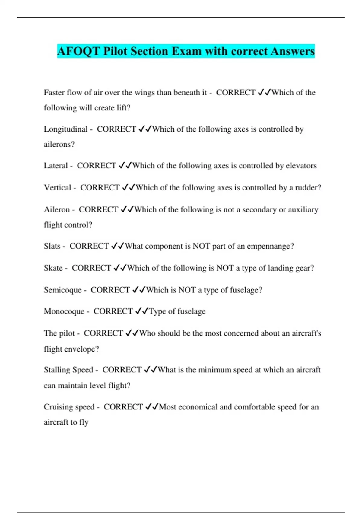 AFOQT Pilot Section Exam with correct Answers Faster flow of air over the wings than beneath it - CORRECT ️️ Which of the following will create lift? Longitudinal - CORRECT ️️ Which of the following axes is controlled by ailerons? Lateral - CORRECT ️️ Which of the following axes is controlled by elevators Vertical - CORRECT ️️ Which of the following axes is controlled by a rudder? Aileron - CORRECT ️️ Which of the following is not a secondary or auxiliary flight control? Slats - CORRECT ️️ What component is NOT part of an empennange? Skate - CORRECT ️️ Which of the following is NOT a type of landing gear? Semicoque - CORRECT ️️ Which is NOT a type of fuselage? Monocoque - CORRECT ️️ Type of fuselage The pilot - CORRECT ️️ Who should be the most concerned about an aircraft's flight envelope? Stalling Speed - CORRECT ️️ What is the minimum speed at which an aircraft can maintain level flight? Cruising speed - CORRECT ️️ Most economical and comfortable speed for an aircraft to fly