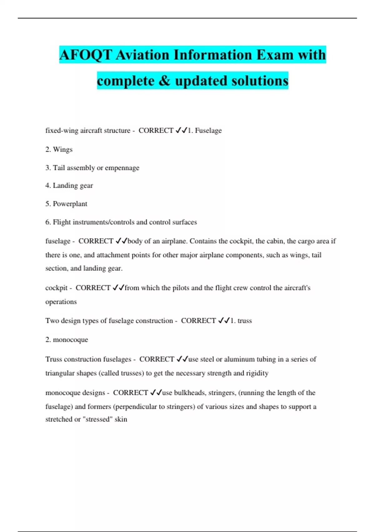 AFOQT Aviation Information Exam with complete & updated solutions fixed-wing aircraft structure - CORRECT ️️ 1. Fuselage 2. Wings 3. Tail assembly or empennage 4. Landing gear 5. Powerplant 6. Flight instruments/controls and control surfaces fuselage - CORRECT ️️ body of an airplane. Contains the cockpit, the cabin, the cargo area if there is one, and attachment points for other major airplane components, such as wings, tail section, and landing gear. cockpit - CORRECT ️️ from which the pilots and the flight crew control the aircraft's operations Two design types of fuselage construction - CORRECT ️️ 1. truss 2. monocoque Truss construction fuselages - CORRECT ️️ use steel or aluminum tubing in a series of triangular shapes (called trusses) to get the necessary strength and rigidity monocoque designs - CORRECT ️️ use bulkheads, stringers, (running the length of the fuselage) and formers (perpendicular to stringers) of various sizes and shapes to support a stretched or "stressed" skin wings - CORRECT ️️ airfoils attached to each side of the fuselage that serve as the main lifting surfaces supporting the airplane in flight. airfoil - CORRECT ️️ an aircraft part or surface (such as wing, propeller blade, or rudder) that controls lift, direction, stability, thrust, or propulsion for the aircraft. monoplanes - CORRECT ️️ airplanes with one set of wings biplanes - CORRECT ️️ airplanes with two sets of wings cantilever wing - CORRECT ️️ requires no external bracing, getting its support from internal wing spars, ribs, and stringers, as well as the construction of the wing's skin or covering semi-cantilever wing - CORRECT ️️ requires both internal bracing and external support from struts attached to the fuselage ailerons - CORRECT ️️ extend from about the middle of the wing out toward the wingtip; they move in opposite directions to create aerodyna
