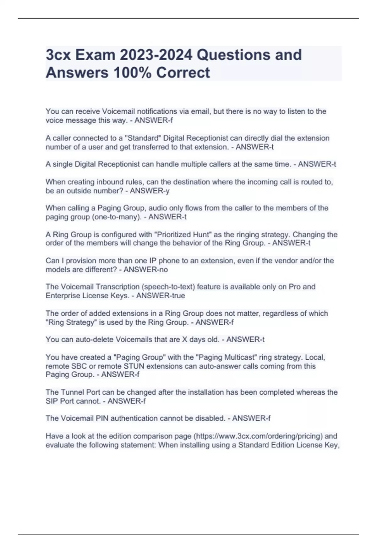 A single Digital Receptionist can handle multiple callers at the same time. - ANSWER-t When creating inbound rules, can the destination where the incoming call is routed to, be an outside number? - ANSWER-y When calling a Paging Group, audio only flows from the caller to the members of the paging group (one-to-many). - ANSWER-t A Ring Group is configured with "Prioritized Hunt" as the ringing strategy. Changing the order of the members will change the behavior of the Ring Group. - ANSWER-t Can I provision more than one IP phone to an extension, even if the vendor and/or the models are different? - ANSWER-no The Voicemail Transcription (speech-to-text) feature is available only on Pro and Enterprise License Keys. - ANSWER-true The order of added extensions in a Ring Group does not matter, regardless of which "Ring Strategy" is used by the Ring Group. - ANSWER-f You can auto-delete Voicemails that are X days old. - ANSWER-t You have created a "Paging Group" with the "Paging Multicast" ring strategy. Local, remote SBC or remote STUN extensions can auto-answer calls coming from this Paging Group. - ANSWER-f