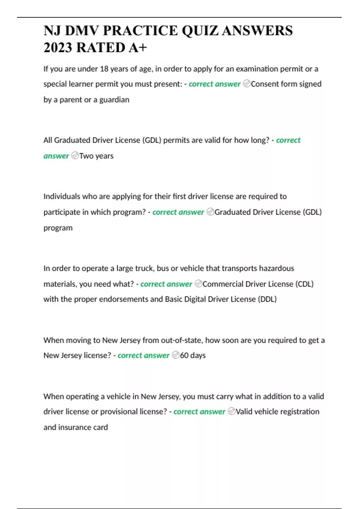 NJ DMV PRACTICE QUIZ ANSWERS 2023 RATED A+