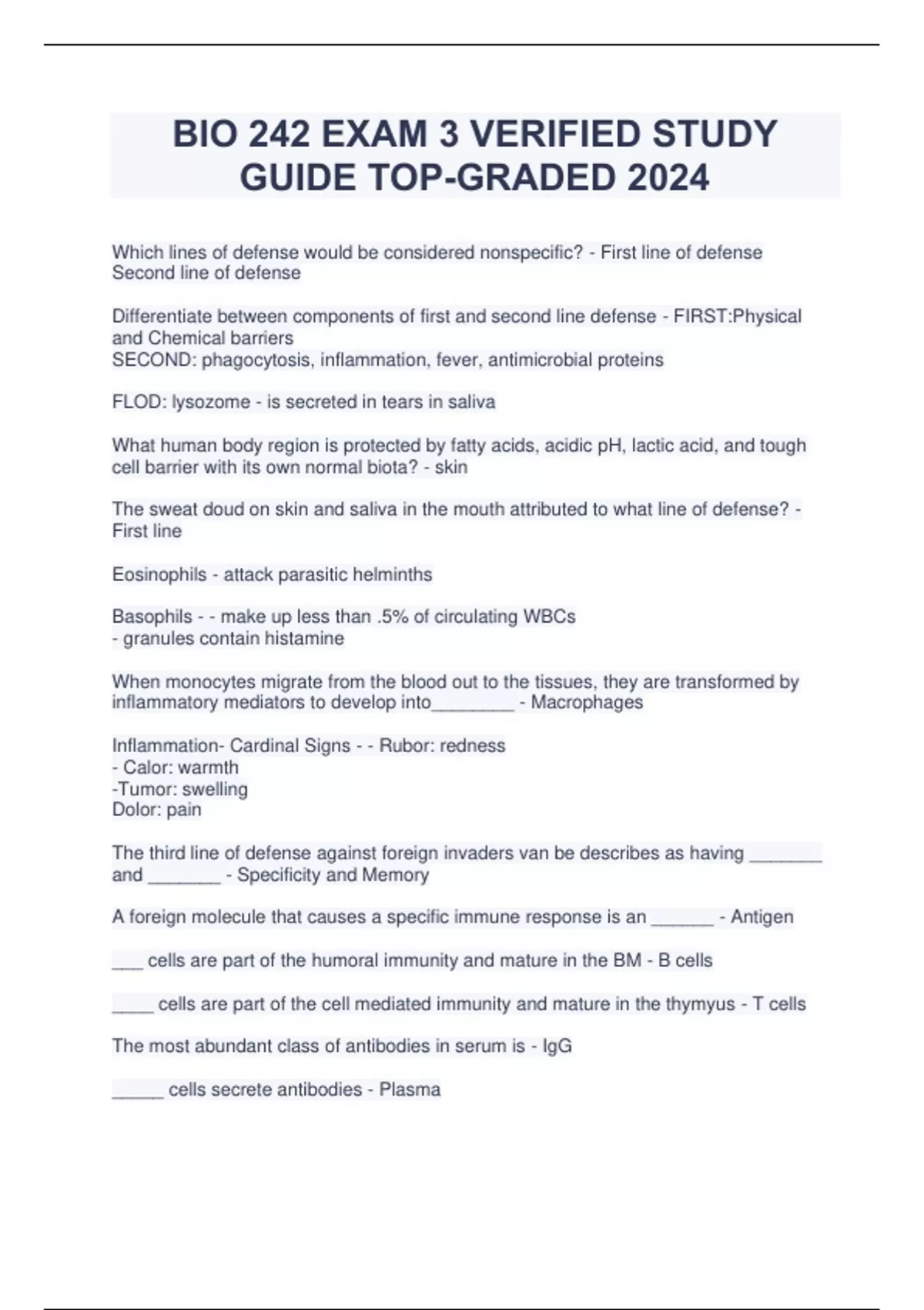 Which lines of defense would be considered nonspecific? - First line of defense Second line of defense Differentiate between components of first and second line defense - FIRST:Physical and Chemical barriers SECOND: phagocytosis, inflammation, fever, antimicrobial proteins FLOD: lysozome - is secreted in tears in saliva What human body region is protected by fatty acids, acidic pH, lactic acid, and tough cell barrier with its own normal biota? - skin The sweat doud on skin and saliva in the mouth attributed to what line of defense? - First line Eosinophils - attack parasitic helminths Basophils - - make up less than .5% of circulating WBCs - granules contain histamine When monocytes migrate from the blood out to the tissues, they are transformed by inflammatory mediators to develop into________ - Macrophages Inflammation- Cardinal Signs - - Rubor: redness - Calor: warmth -Tumor: swelling Dolor: pain The third line of defense against foreign invaders van be describes as having _______ and _______ - Specificity and Memory A foreign molecule that causes a specific immune response is an ______ - Antigen ___ cells are part of the humoral immunity and mature in the BM - B cells ____ cells are part of the cell mediated immunity and mature in the thymyus - T cells The most abundant class of antibodies in serum is - IgG _____ cells secrete antibodies - Plasma