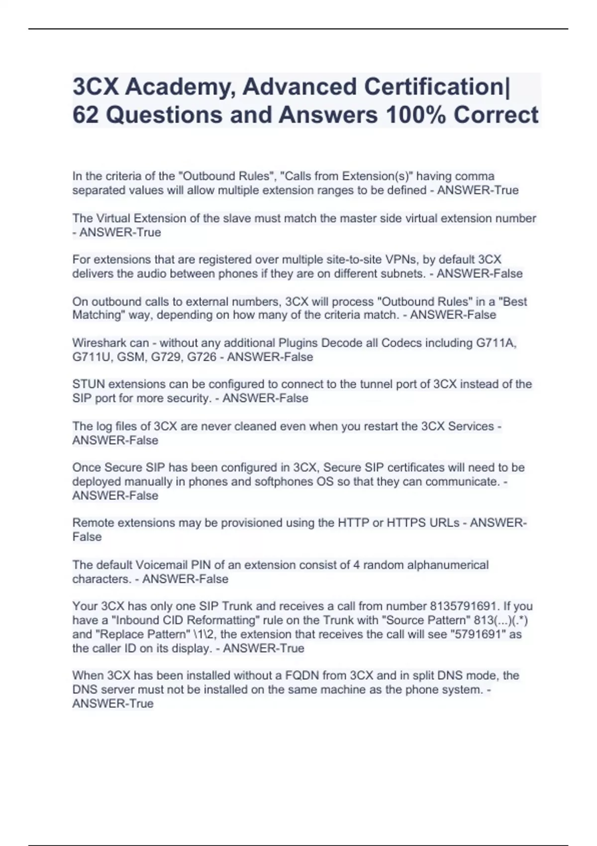 For extensions that are registered over multiple site-to-site VPNs, by default 3CX delivers the audio between phones if they are on different subnets. - ANSWER-False On outbound calls to external numbers, 3CX will process "Outbound Rules" in a "Best Matching" way, depending on how many of the criteria match. - ANSWER-False Wireshark can - without any additional Plugins Decode all Codecs including G711A, G711U, GSM, G729, G726 - ANSWER-False STUN extensions can be configured to connect to the tunnel port of 3CX instead of the SIP port for more security. - ANSWER-False The log files of 3CX are never cleaned even when you restart the 3CX Services - ANSWER-False Once Secure SIP has been configured in 3CX, Secure SIP certificates will need to be deployed manually in phones and softphones OS so that they can communicate. - ANSWER-False Remote extensions may be provisioned using the HTTP or HTTPS URLs - ANSWER-False The default Voicemail PIN of an extension consist of 4 random alphanumerical characters. - ANSWER-False Your 3CX has only one SIP Trunk and receives a call from number . If you have a "Inbound CID Reformatting" rule on the Trunk with "Source Pattern" 813(...)(.*) and "Replace Pattern" 12, the extension that receives the call will see "5791691" as the caller ID on its display. - ANSWER-True