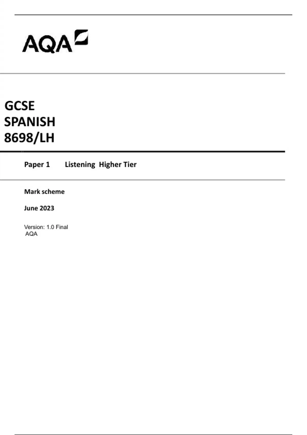AQA GCSE SPANISH 8698/LH Paper 1 Listening Higher Tier Mark scheme June 2023 Version: 1.0 Final