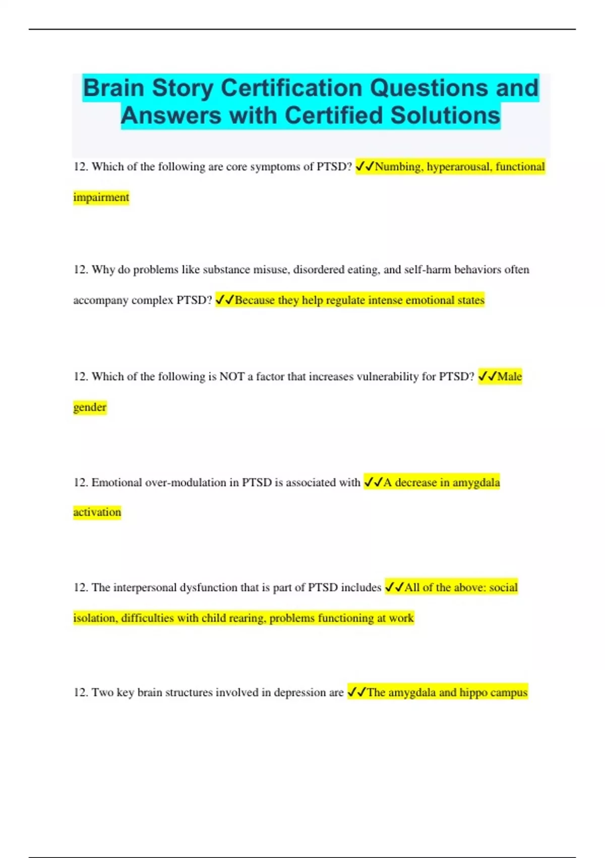 Brain Story Certification Questions and Answers with Certified Solutions 12. Which of the following are core symptoms of PTSD? Numbing, hyperarousal, functional impairment 12. Why do problems like substance misuse, disordered eating, and self-harm behaviors often accompany complex PTSD? Because they help regulate intense emotional states 12. Which of the following is NOT a factor that increases vulnerability for PTSD? Male gender 12. Emotional over-modulation in PTSD is associated with A decrease in amygdala activation 12. The interpersonal dysfunction that is part of PTSD includes All of the above: social isolation, difficulties with child rearing, problems functioning at work 12. Two key brain structures involved in depression are The amygdala and hippo campus 12. What common signaling system most likely underlies the strong association between depression and physical illnesses such as heart disease, diabetes, and obesity? Stress system 4. Human infants need to be taught how to react to social cues by: Nothing - Infants have an innate ability to respond to social cues (trick question suckka) 4. How do social interactions with attentive adults support learning in children? All of the above: They direct the child's attention to important aspects of the task, they make learning fun for the child, they can be used to adapt the learning to meet an individual child's needs. 4. In child development, joint attention refers to: The infant co-ordinates his or her attention with an adult and another object in the environment. 4. Which of the following factors is most likely to increase the quality and quantity of serve-and-return interactions for a child? Secure attachment 4. Which aspect of development is NOT affected by social interactions? None of the above 4. What brain region is most involved in behavioral inhibition? The amygdala 10. Which of the following adverse childhood experiences was not included as part of the ACE Study? Growing up in a neighbourhood with community violence. 10. If ACE's could be prevented, which of the following would most likely also occur? Economic productivity would increase. 10. What mechanism helps to explain the association between ACE's and cardiovascular disease in adulthood? Activation of inflammatory pathways 10. An individual with a high ACE score is more likely to: Have multiple, lifetime mental health diagnosis 10. What explanation does Dr. Felitti give for the cause of addiction? Addiction is a solution to a problem caused by exposure to stressful life experiences 10. What reason does Dr. Felitti give to explain why addiction is so challenging to treat? Treating the solution to someone's problem may be threatening and cause them to flee treatment. 15. Imaging studies have shown grey matter increases in mothers brains from 2-4 weeks to 3-4 months postpartum. What best predicts this increase? The mother's positive perception of her baby 15. What system is activated when a parent views images of their own baby? Both A and C: Reward system, Emotional appraisal system 15. What predicts how much oxytocin a mother releases in response to her own baby? The mother's attachment style 15. Dr. Mayes describes the attachment system as performing what key function for a child? Regulating Stress 15. Which of the following is NOT a parental capacity that is mediated by the executive function system? None of the above 15. Substance misusing mothers typically withdraw from their baby's distress and show more negative affect and heightened physical provocation in interactions. What is this most likely due to? A heightened stress response 9. Key elements of successful prevention programs are: A focus on two generational approaches with a population impact. 9. The application of EBT's in real-world clinical settings can be improved by: Integrating various EBT's to address co-morbidity, clinical caseload, and the need to potentially adjust treatment while underway. 9. What is the answer that best describes what is included in the Modular Approach to Treatment for Children (MATCH)? All of the above: Emotional or affect regulation, Cognitive regulation, Behavioral regulation 9. It is important to provide prevention programs for children of patients with depression because: All of the above 9. Compared to usual care, an evidence-based therapy (EBT): Has been tested sufficiently through research to be called an evidence-based therapy. 9. Which key factor is unique to a pre-emptive approach to mental disorders? A biologically-based theory of the disorder that allows for personalized, predictive tools such as biomarkers. 6. Executive function skills finish maturing at about what age? 25 11. Which of the following is a unique characteristic of the Healthy Steps Program? Adults are treated in pediatric primary care settings 11. What is the main benefit of the Healthy Steps Program? It gives parents with ACEs the care they need to support their child and keep the child's ACE score as low as possible 11. What does Dr. Briggs emphasize as an important part of obtaining a parent's ACE history? It is done universally. for all parents, not just those who the staff suspect may have ACEs. 13. What is one of the main brain regions involved in the preoccupation/anticipation stage of the addiction cycle? Prefrontal cortex 6. Between what ages do executive function skills show the most dramatic period of growth? 3-5 years 6. Which set of adult outcomes are associated with low childhood inhibitory control? criminal convictions, physical health problems, and substance misuse disorders 11. What does Dr. Felitti recommend when taking an ACE history in health care settings? Acknowledge how ACEs might have impacted the patient's life by asking: "How has this affected you later in life?" 13. What is the major event that characterizes the withdrawal/negative affect stage of addiction? The stress system is engaged 19. Which skill does the program called Filming Interactions to Nurture Development focus