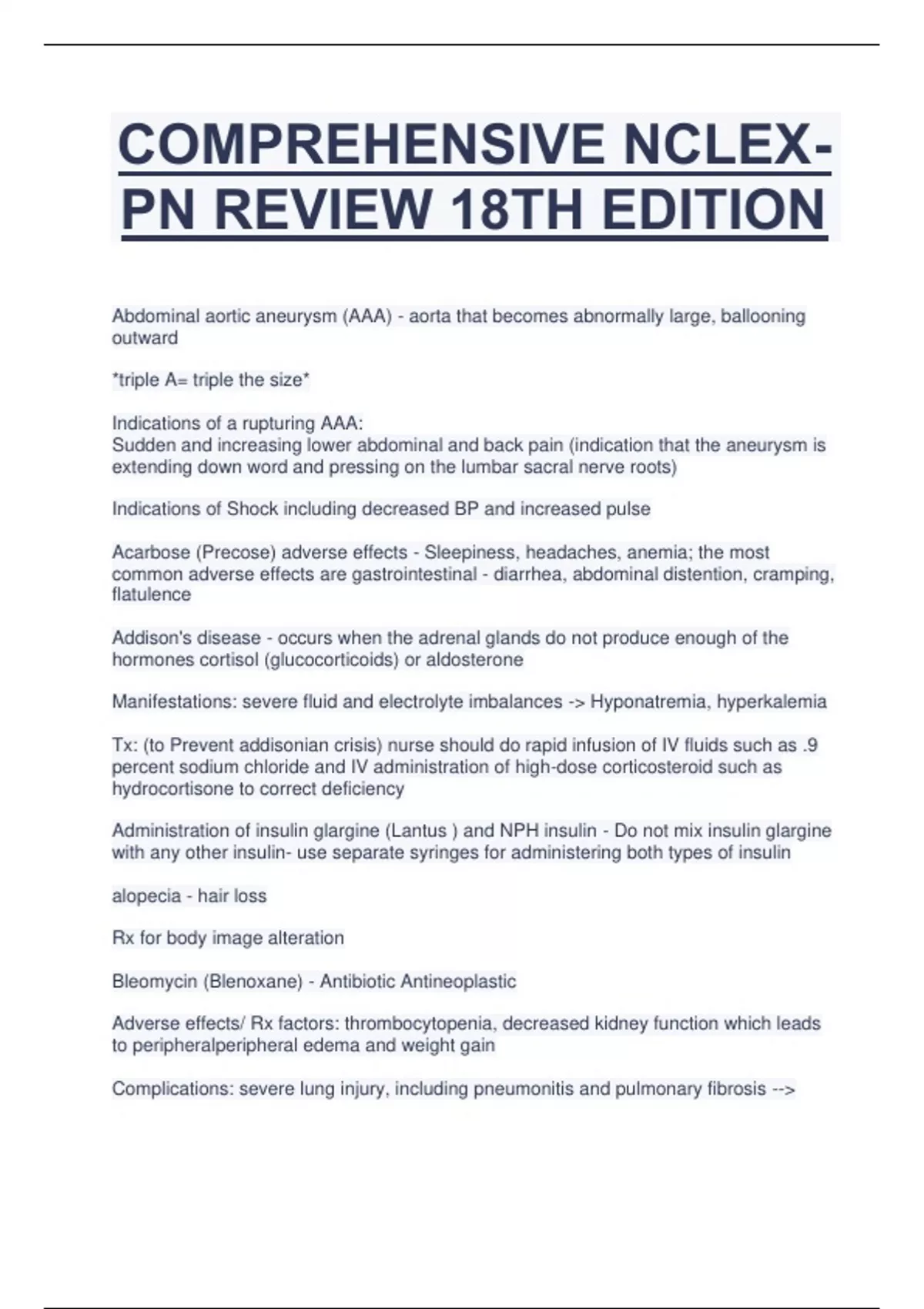 Abdominal aortic aneurysm (AAA) - aorta that becomes abnormally large, ballooning outward *triple A= triple the size* Indications of a rupturing AAA: Sudden and increasing lower abdominal and back pain (indication that the aneurysm is extending down word and pressing on the lumbar sacral nerve roots) Indications of Shock including decreased BP and increased pulse Acarbose (Precose) adverse effects - Sleepiness, headaches, anemia; the most common adverse effects are gastrointestinal - diarrhea, abdominal distention, cramping, flatulence Addison's disease - occurs when the adrenal glands do not produce enough of the hormones cortisol (glucocorticoids) or aldosterone Manifestations: severe fluid and electrolyte imbalances -> Hyponatremia, hyperkalemia Tx: (to Prevent addisonian crisis) nurse should do rapid infusion of IV fluids such as .9 percent sodium chloride and IV administration of high-dose corticosteroid such as hydrocortisone to correct deficiency Administration of insulin glargine (Lantus ) and NPH insulin - Do not mix insulin glargine with any other insulin- use separate syringes for administering both types of insulin alopecia - hair loss Rx for body image alteration Bleomycin (Blenoxane) - Antibiotic Antineoplastic Adverse effects/ Rx factors: thrombocytopenia, decreased kidney function which leads to peripheralperipheral edema and weight gain Complications: severe lung injury, including pneumonitis and pulmonary fibrosis -->