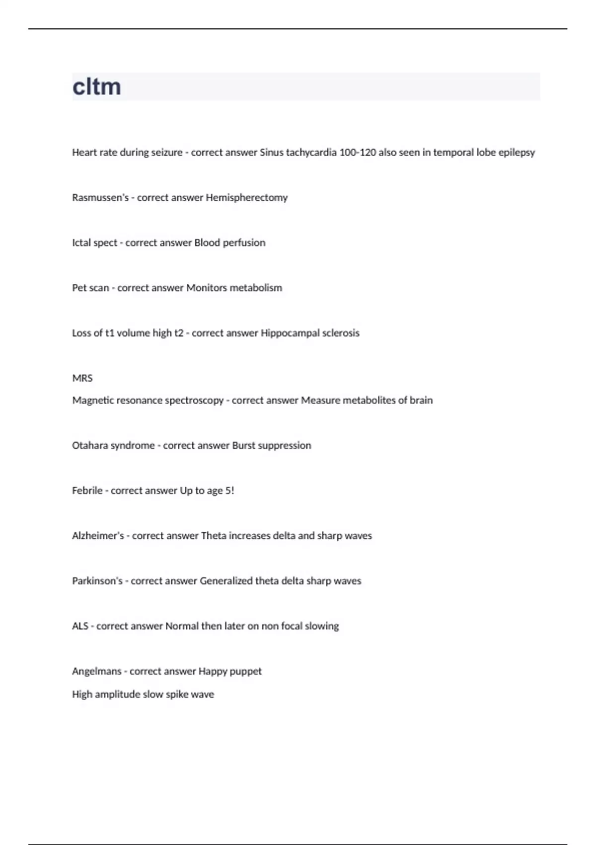 Heart rate during seizure - correct answer Sinus tachycardia 100-120 also seen in temporal lobe epilepsy Rasmussen's - correct answer Hemispherectomy Ictal spect - correct answer Blood perfusion Pet scan - correct answer Monitors metabolism Loss of t1 volume high t2 - correct answer Hippocampal sclerosis MRS Magnetic resonance spectroscopy - correct answer Measure metabolites of brain Otahara syndrome - correct answer Burst suppression Febrile - correct answer Up to age 5! Alzheimer's - correct answer Theta increases delta and sharp waves Parkinson's - correct answer Generalized theta delta sharp waves ALS - correct answer Normal then later on non focal slowing Angelmans - correct answer Happy puppet High amplitude slow spike wave Foramen Ovale electrodes monitor - correct answer mesial temporal lobe Nasopharyngeal electrodes - correct answer anteromedial frontal lobe, should not use due to irritation Crani - correct answer Grid electrodes Burr Holes- - correct answer Strip electrodes Sensorimotor localization - correct answer Band Pass 1-30Hz to 250-1000 Hz (-3db) 50 ms, 25-50 reps, 2 trials, referential montage, use 1 or 1/2 MAC with nitrous EcoG Stimulus threshold - correct answer 70 dB above normal threshold, 10/s, averages, pulse duration .5-1 ms, pulse rate 50-60, stim intensity 0-20 mA, stim length 3-8 sec Cortical Stim threshold - correct answer 1-mA-15mA biphasic prevents tissue damage, 50/sec in trains of 3-5 for motor mapping and 5-10 for language until AD's produced Biphasic stimulation - correct answer prevents tissue damage, reduces risk of polarization or accumulation of ions within cortex EP Grid Sensitivity - correct answer 10-20 uV/div for amp EcoG sensitivity - correct answer 20-70 uV/mm, 30mm/sec for amp TIVA - correct answer S S E P no inhalations agents used Cortical Mapping anesthesia - correct answer Propofol and remifentanil used + ketamine no muscle relaxant EcoG anesthesia - correct answer low dose Propofol subarachnoid hemorrhage - correct answer causes ischemia Gelastic epilepsy - correct answer Hypothalamic Harmartoma Herpes Simplex pattern - correct answer temporal Pleds and slowing West syndrome - correct answer starts age 2-5 moths Occipital OVM - correct answer post of seizures, homonymous visual field loss, Hemispherectomy or Functional may reduce Seizures Left AVM - correct answer focal and secondarily generalized Supplementary Motor area - correct answer Fencing BRE - correct answer Needs sleep during test, 6 hours centro-temporal spikes may not treat JME - correct answer GTC almost all, Normal intelligence, Photosensitive EEG frontally dominant 4-6hz ictal faster/gen sw, 3.5-4 Hz polyspike Depakote ESES - correct answer non rem sleep and Landau Kelffner PNES - correct answer hip thrusting, opisthotonic posturing