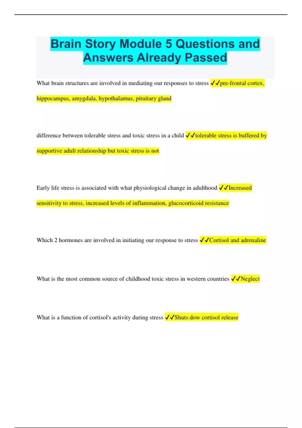 Brain Story Module 5 Questions and Answers Already Passed What brain structures are involved in mediating our responses to stress pre-frontal cortex, hippocampus, amygdala, hypothalamus, pituitary gland difference between tolerable stress and toxic stress in a child tolerable stress is buffered by supportive adult relationship but toxic stress is not Early life stress is associated with what physiological change in adulthood Increased sensitivity to stress, increased levels of inflammation, glucocorticoid resistance Which 2 hormones are involved in initiating our response to stress Cortisol and adrenaline What is the most common source of childhood toxic stress in western countries Neglect What is a function of cortisol's activity during stress Shuts dow cortisol release