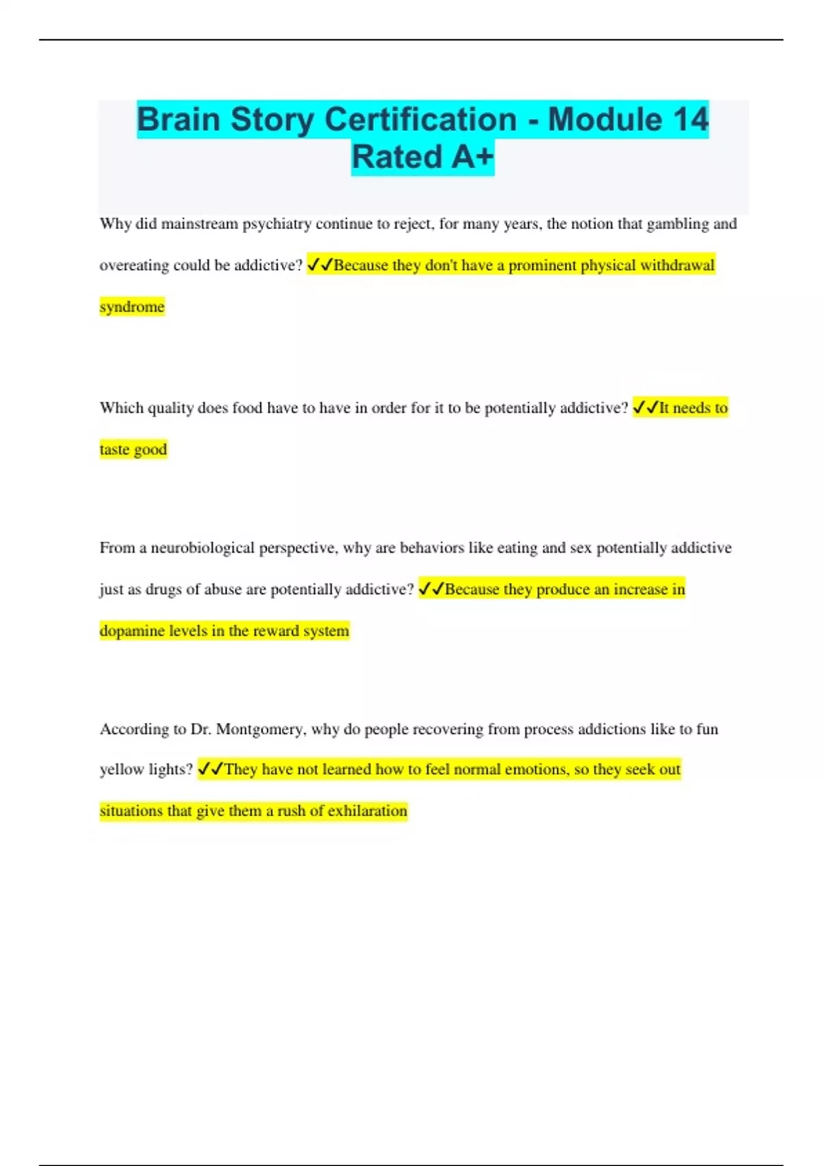 Brain Story Certification - Module 14 Rated A+ Why did mainstream psychiatry continue to reject, for many years, the notion that gambling and overeating could be addictive? Because they don't have a prominent physical withdrawal syndrome Which quality does food have to have in order for it to be potentially addictive? It needs to taste good From a neurobiological perspective, why are behaviors like eating and sex potentially addictive just as drugs of abuse are potentially addictive? Because they produce an increase in dopamine levels in the reward system According to Dr. Montgomery, why do people recovering from process addictions like to fun yellow lights? They have not learned how to feel normal emotions, so they seek out situations that give them a rush of exhilaration Addiction interaction disorder is characterized by many different patterns of behavior. Which of the following best describes disinhibiting behavior? Using one substance or behavior to lower boundaries to using another Trauma is at the core of many process and substance addictions, and many people with addictions show particular patterns of trauma reactions. Which of the following best describes trauma splitting? Dissociating from painful experiences and not integrating them into the self or daily life