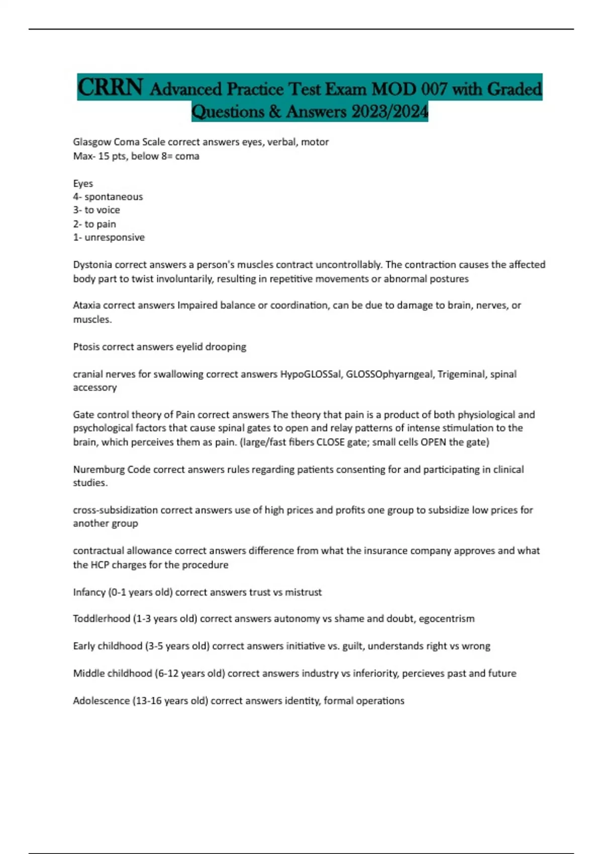 CRRN Advanced Practice Test Exam MOD 007 with Graded Questions & Answers 2023/2024 Glasgow Coma Scale correct answers eyes, verbal, motor Max- 15 pts, below 8= coma Eyes 4- spontaneous 3- to voice 2- to pain 1- unresponsive Dystonia correct answers a person's muscles contract uncontrollably. The contraction causes the affected body part to twist involuntarily, resulting in repetitive movements or abnormal postures Ataxia correct answers Impaired balance or coordination, can be due to damage to brain, nerves, or muscles. Ptosis correct answers eyelid drooping cranial nerves for swallowing correct answers HypoGLOSSal, GLOSSOphyarngeal, Trigeminal, spinal accessory Gate control theory of Pain correct answers The theory that pain is a product of both physiological and psychological factors that cause spinal gates to open and relay patterns of intense stimulation to the brain, which perceives them as pain. (large/fast fibers CLOSE gate; small cells OPEN the gate) Nuremburg Code correct answers rules regarding patients consenting for and participating in clinical studies. cross-subsidization correct answers use of high prices and profits one group to subsidize low prices for another group contractual allowance correct answers difference from what the insurance company approves and what the HCP charges for the procedure Infancy (0-1 years old) correct answers trust vs mistrust Toddlerhood (1-3 years old) correct answers autonomy vs shame and doubt, egocentrism Early childhood (3-5 years old) correct answers initiative vs. guilt, understands right vs wrong Middle childhood (6-12 years old) correct answers industry vs inferiority, percieves past and future Adolescence (13-16 years old) correct answers identity, formal operations Moses' Grief Response correct answers Denial, Anxiety, Depression, and Anger/Guilt