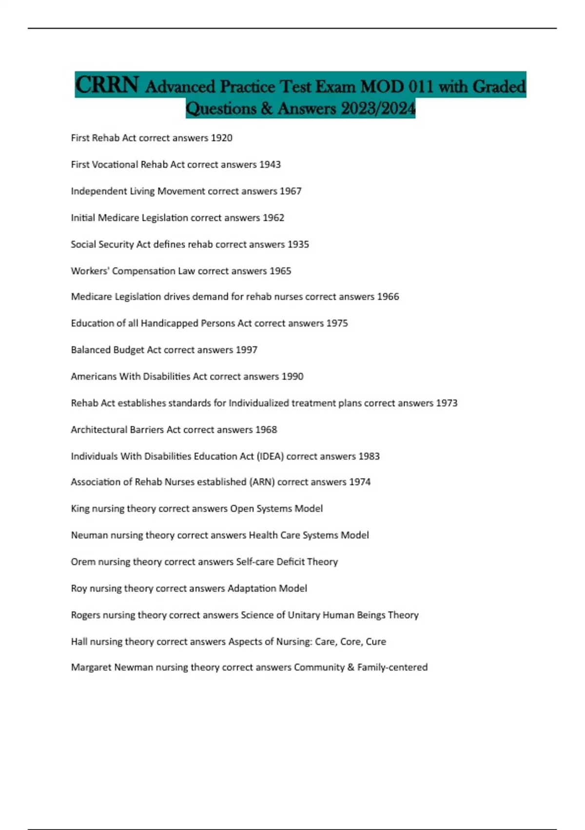 CRRN Advanced Practice Test Exam MOD 011 with Graded Questions & Answers First Rehab Act correct answers 1920 First Vocational Rehab Act correct answers 1943 Independent Living Movement correct answers 1967 Initial Medicare Legislation correct answers 1962 Social Security Act defines rehab correct answers 1935 Workers' Compensation Law correct answers 1965 Medicare Legislation drives demand for rehab nurses correct answers 1966 Education of all Handicapped Persons Act correct answers 1975 Balanced Budget Act correct answers 1997 Americans With Disabilities Act correct answers 1990 Rehab Act establishes standards for Individualized treatment plans correct answers 1973 Architectural Barriers Act correct answers 1968 Individuals With Disabilities Education Act (IDEA) correct answers 1983 Association of Rehab Nurses established (ARN) correct answers 1974
