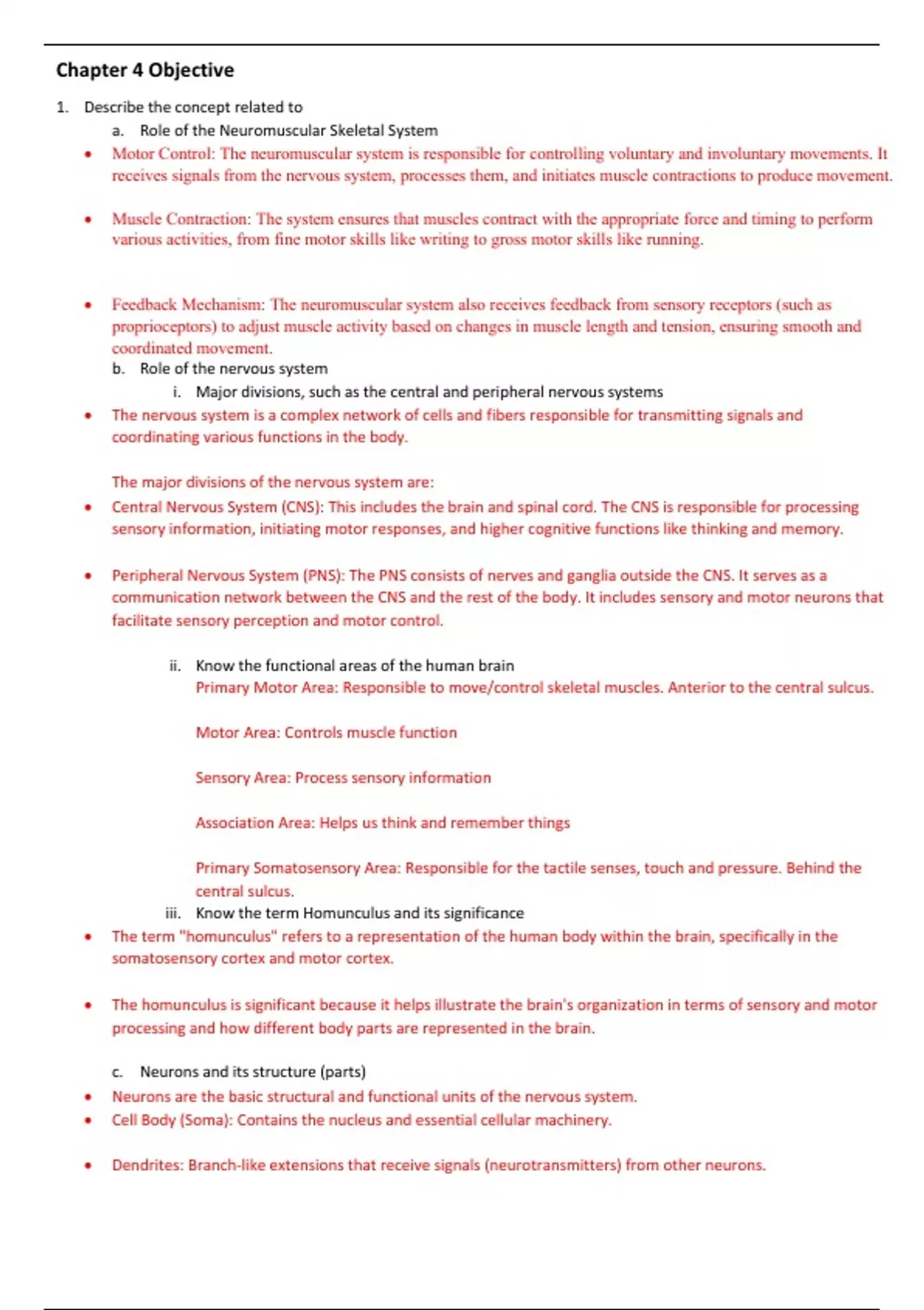 1. Describe the concept related to a. Role of the Neuromuscular Skeletal System b. Role of the nervous system i. Major divisions, such as the central and peripheral nervous systems ii. Know the functional areas of the human brain iii. Know the term Homunculus and its significance c. Neurons and its structure (parts) i. Types of Neurons 2. What is the neuromuscular junction? a. Know the term like Synapse and how it helps communicate between neurons/neurons to muscle. 3. What is a Motor unit? a. Know its anatomy b. Significance of the ratio of fibers to neurons that are innervated. 4. Understand the differences between the three motor unit types (I, IIa, and IIb). 5. Review the concept (from Chapter 3) like twitch influencing single muscle contraction a. Describe the pattern of motor unit contribution to a muscle contraction through i. the size principle, ii. synchronization, iii. motor unit recruitment, and rate coding. 6. What is Electromyography (EMG)? a. What are its applications? b. How do we collect EMG? i. List the different types of Electrodes Types used. ii. How do electrodes are configured (placed onto) the skin while collecting EMG iii. Understand the difference between raw EMG and how noises impact EMG signals. c. What is MU action potential? d. What are the factors that could influence EMG signal? e. Discuss the steps involved in processing the EMG signal. 7. Review the concept (from Chapter 3) of Electromechanical delay 8. Explain the force-EMG relationship 9. Discuss the components of a reflex action and provide examples. a. List the different types of reflexes. 10. Describe the anatomy of the muscle spindle and the functional characteristics of the spindle to stretch. 11. Describe the anatomy of the Golgi tendon organ (GTO) and how the GTO responds to tension in the muscle. a. What is the Inverse Stretch Reflex (Autogenic Inhibition Reflex) role? 12. Discuss the types of Tactile and Joint Sensory Receptors in our synovial joint. 13. Discuss the effect of exercise and training on neural input and activation levels in the muscle.