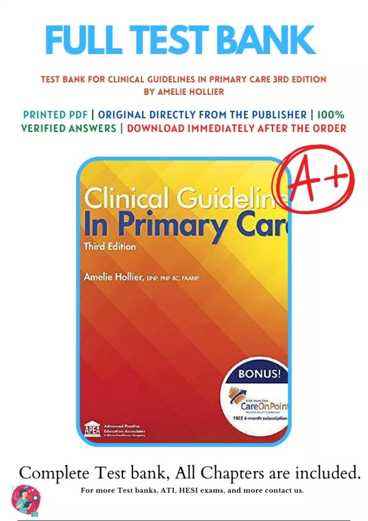 Test Bank For Clinical Guidelines in Primary Care 3rd Edition by Amelie Hollier| (2018/2019), 9781892418258, Chapter 1-19 Complete Questions and Answers A+