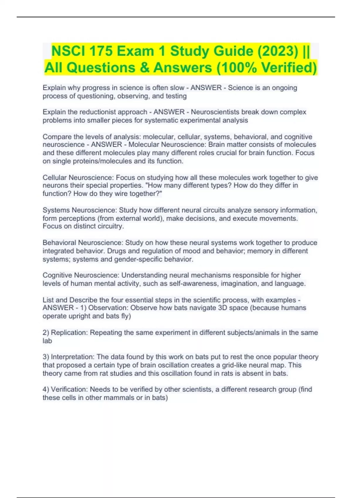 NSCI 175 Exam 1 Study Guide (2023) || All Questions & Answers (100% Verified) NSCI 175 Exam 1 Study Guide (2023) || All Questions & Answers (100% Verified) Explain why progress in science is often slow - ANSWER - Science is an ongoing process of questioning, observing, and testing Explain the reductionist approach - ANSWER - Neuroscientists break down complex problems into smaller pieces for systematic experimental analysis Compare the levels of analysis: molecular, cellular, systems, behavioral, and cognitive neuroscience - ANSWER - Molecular Neuroscience: Brain matter consists of molecules and these different molecules play many different roles crucial for brain function. Focus on single proteins/molecules and its function. Cellular Neuroscience: Focus on studying how all these molecules work together to give neurons their special properties. "How many different types? How do they differ in function? How do they wire together?" Systems Neuroscience: Study how different neural circuits analyze sensory information, form perceptions (from external world), make decisions, and execute movements. Focus on distinct circuitry. Behavioral Neuroscience: Study on how these neural systems work together to produce integrated behavior. Drugs and regulation of mood and behavior; memory in different systems; systems and gender-specific behavior. Cognitive Neuroscience: Understanding neural mechanisms responsible for higher levels of human mental activity, such as self-awareness, imagination, and language. List and Describe the four essential steps in the scientific process, with examples - ANSWER - 1) Observation: Observe how bats navigate 3D space (because humans operate upright and bats fly) 2) Replication: Repeating the same experiment in different subjects/animals in the same lab 3) Interpretation: The data found by this work on bats put to rest the once popular theory that proposed a certain type of brain oscillation creates a grid-like neural map. This theory came from rat studies and this oscillation found in rats is absent in bats. 4) Verification: Needs to be verified by other scientists, a different research group (find these cells in other mammals or in bats) Discuss the importance of animal research in the field of neuroscience - ANSWER - Animal research is not just about testing drugs, it is about understanding basic biology. Many helpful (to humans) things have been created by animal research: Blood transfusions; Insulin; Asthma inhalers; Hip replacements; Vaccines; Antidepressants; etc Explain when animal research is needed - ANSWER - When there is not enough information to make a model of the animal. Or when ethics will not allow for the research to occur on humans.