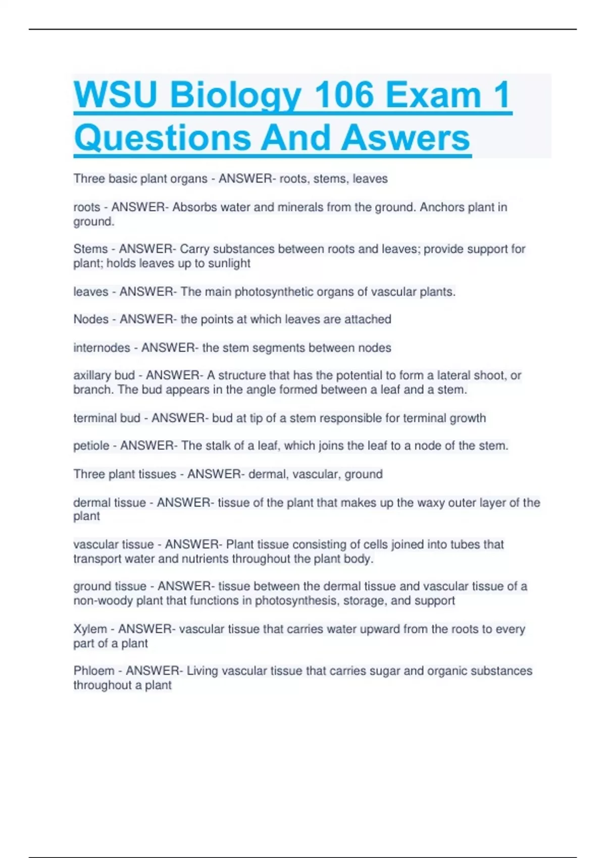 WSU Biology 106 Exam 1 Questions And Aswers Three basic plant organs - ANSWER- roots, stems, leaves roots - ANSWER- Absorbs water and minerals from the ground. Anchors plant in ground. Stems - ANSWER- Carry substances between roots and leaves; provide support for plant; holds leaves up to sunlight leaves - ANSWER- The main photosynthetic organs of vascular plants. Nodes - ANSWER- the points at which leaves are attached internodes - ANSWER- the stem segments between nodes axillary bud - ANSWER- A structure that has the potential to form a lateral shoot, or branch. The bud appears in the angle formed between a leaf and a stem. terminal bud - ANSWER- bud at tip of a stem responsible for terminal growth petiole - ANSWER- The stalk of a leaf, which joins the leaf to a node of the stem. Three plant tissues - ANSWER- dermal, vascular, ground dermal tissue - ANSWER- tissue of the plant that makes up the waxy outer layer of the plant vascular tissue - ANSWER- Plant tissue consisting of cells joined into tubes that transport water and nutrients throughout the plant body. ground tissue - ANSWER- tissue between the dermal tissue and vascular tissue of a non-woody plant that functions in photosynthesis, storage, and support Xylem - ANSWER- vascular tissue that carries water upward from the roots to every part of a plant Phloem - ANSWER- Living vascular tissue that carries sugar and organic substances throughout a plant parenchyma - ANSWER- Fundamental tissue composed of thin-walled living cells that function in photosynthesis and storage. Collenchyma - ANSWER- type of ground tissue cell with a strong, flexible cell wall; helps support larger plants Sclerenchyma - ANSWER- type of ground-tissue cell with an extremely thick, rigid cell wall that makes ground tissue tough and strong apical meristem - ANSWER- Embryonic plant tissue in the tips of roots and in the buds of shoots that supplies cells for the plant to grow in length. lateral meristems - ANSWER- A meristem that thickens the roots and shoots of woody plants. The vascular cambium and cork cambium are lateral meristems. shoot apical meristem - ANSWER- dome-shaped mass of dividing cells at the shoot tip Gymnosperms and eudicots - ANSWER- vascular bundles are arranged in a ring Monocots - ANSWER- vascular bundles are scattered throughout the stem secondary growth - ANSWER- Growth produced by lateral meristems, which thickens the roots and shoots of woody plants. vascular cambium - ANSWER- A cylinder of meristematic tissue in woody plants that adds layers of secondary vascular tissue called secondary xylem (wood) and secondary phloem. cork cambium - ANSWER- Lateral meristematic tissue that produces the outer covering of stems turgor pressure - ANSWER- The pressure that water molecules exert against the cell wall turgid - ANSWER- swollen, inflated flaccid - ANSWER- deflated, limp apoplastic route - ANSWER- water and solutes move along the continuum of cell walls and extracellular spaces Sympoplastic route - ANSWER- transport within the membrane active transport - ANSWER- Energy-requiring process that moves material across a cell membrane against a concentration difference passive transport - ANSWER- the movement of substances across a cell membrane without the use of energy by the cell Bulk/mass flow - ANSWER- mass movement of liquid caused by pressure, gravity, or both Stomata - ANSWER- Small openings on the underside of a leaf through which oxygen and carbon dioxide can move phloem sap - ANSWER- a mixture of sugar, nutrients, and water that flows through phloem vessels in a plant transportation of sugar - ANSWER- loading, osmosis, phloem turgor pressure increase, water pressure push, unloading, water back into xylem Xylem movement - ANSWER- pull-powered Phloem movement - ANSWER- push-powered Soil contains - ANSWER- minerals, water, gases, living o