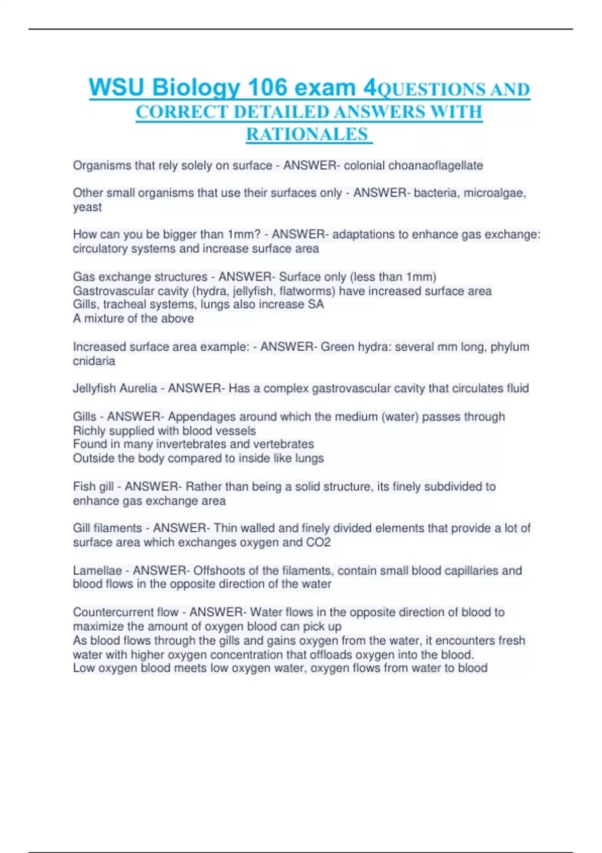 WSU Biology 106 exam 4QUESTIONS AND CORRECT DETAILED ANSWERS WITH RATIONALES Organisms that rely solely on surface - ANSWER- colonial choanaoflagellate Other small organisms that use their surfaces only - ANSWER- bacteria, microalgae, yeast How can you be bigger than 1mm? - ANSWER- adaptations to enhance gas exchange: circulatory systems and increase surface area Gas exchange structures - ANSWER- Surface only (less than 1mm) Gastrovascular cavity (hydra, jellyfish, flatworms) have increased surface area Gills, tracheal systems, lungs also increase SA A mixture of the above Increased surface area example: - ANSWER- Green hydra: several mm long, phylum cnidaria Jellyfish Aurelia - ANSWER- Has a complex gastrovascular cavity that circulates fluid Gills - ANSWER- Appendages around which the medium (water) passes through Richly supplied with blood vessels Found in many invertebrates and vertebrates Outside the body compared to inside like lungs Fish gill - ANSWER- Rather than being a solid structure, its finely subdivided to enhance gas exchange area Gill filaments - ANSWER- Thin walled and finely divided elements that provide a lot of surface area which exchanges oxygen and CO2 Lamellae - ANSWER- Offshoots of the filaments, contain small blood capillaries and blood flows in the opposite direction of the water Countercurrent flow - ANSWER- Water flows in the opposite direction of blood to maximize the amount of oxygen blood can pick up As blood flows through the gills and gains oxygen from the water, it encounters fresh water with higher oxygen concentration that offloads oxygen into the blood. Low oxygen blood meets low oxygen water, oxygen flows from water to blood How does countercurrent flow enable more complete removal of oxygen from the water? - ANSWER- Oxygen exchange allows the blood to pick up 90% of oxygen in the water because the percentage of oxygen concentration is in opposite directions Are gills effective in increasing surface area? - ANSWER- In mackerel, a 20 fold increase due to gills, over 1 square METER How do gill surface areas compare among different fishes? - ANSWER- Numbers correspond to arbitrary units per gram body weight Mackerel has more than a goosefish because goosefish don't need gills since they are poor aerobic swimmers Tracheal systems in insects - ANSWER- Air filled tubes that extend into the body, small insects have passive diffusion only while large insects "breathe" Air sacs vs tracheae Tracheoles supply tissues - ANSWER- Connect to the body cells and the air that comes out uses diffusion which is a short distance from the tracheal to the mitochondria Tracheal system limits the size of insects - ANSWER- Dung beetles provide an opportunity to investigate the effect of body size on the tracheal system Some prehistoric insects had wings as long as a human arm, why? - ANSWER- Thicker exoskeleton to resist gravity Air oxygen levels 30% compared to current levels of 20% Abundant nutrients from feeding on dinosaur