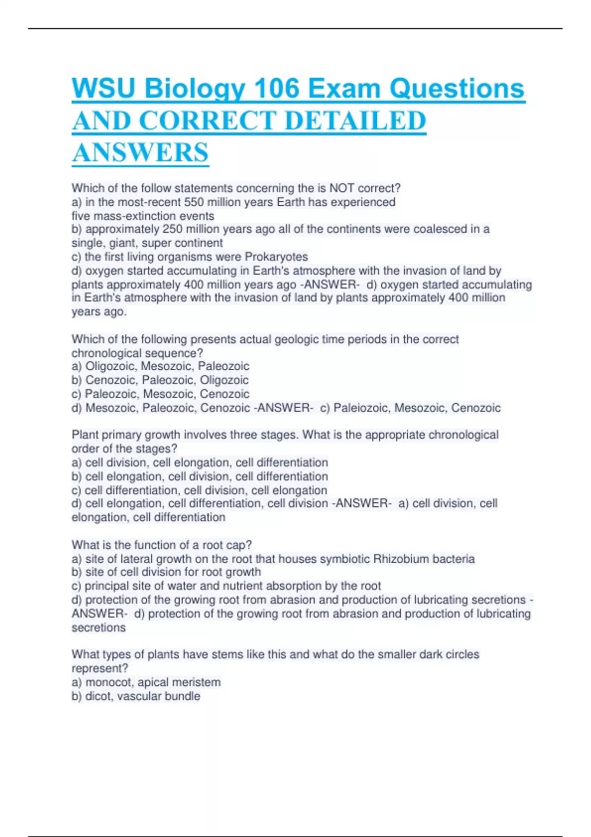WSU Biology 106 Exam Questions AND CORRECT DETAILED ANSWERS Which of the follow statements concerning the is NOT correct? a) in the most-recent 550 million years Earth has experienced five mass-extinction events b) approximately 250 million years ago all of the continents were coalesced in a single, giant, super continent c) the first living organisms were Prokaryotes d) oxygen started accumulating in Earth's atmosphere with the invasion of land by plants approximately 400 million years ago -ANSWER- d) oxygen started accumulating in Earth's atmosphere with the invasion of land by plants approximately 400 million years ago. Which of the following presents actual geologic time periods in the correct chronological sequence? a) Oligozoic, Mesozoic, Paleozoic b) Cenozoic, Paleozoic, Oligozoic c) Paleozoic, Mesozoic, Cenozoic d) Mesozoic, Paleozoic, Cenozoic -ANSWER- c) Paleiozoic, Mesozoic, Cenozoic Plant primary growth involves three stages. What is the appropriate chronological order of the stages? a) cell division, cell elongation, cell differentiation b) cell elongation, cell division, cell differentiation c) cell differentiation, cell division, cell elongation d) cell elongation, cell differentiation, cell division -ANSWER- a) cell division, cell elongation, cell differentiation What is the function of a root cap? a) site of lateral growth on the root that houses symbiotic Rhizobium bacteria b) site of cell division for root growth c) principal site of water and nutrient absorption by the root d) protection of the growing root from abrasion and production of lubricating secretions - ANSWER- d) protection of the growing root from abrasion and production of lubricating secretions What types of plants have stems like this and what do the smaller dark circles represent? a) monocot, apical meristem b) dicot, vascular bundle c) monocot, vascular bundle d) dicot, apical meristem -ANSWER- c) monocot, vascular bundle The lengthening of a cell in a growing root, or shoot, requires that the cell wall lengthen with the rest of the cell. Lengthening of the cell wall results from what process? a) new cellulose fibers are added in a band around the equator of the cell b) loosening of cellulose fibers in the wall followed by the inward movement of water c) new cellulose fibers are added to each end of the cell wall d) dissolving of the cell wall followed by the assembly of a new wall after the cell has lengthened -ANSWER- b) loosening of cellulose fibers in the wall followed by the inward movement of water Moving from the outside of a tree toward the tree's center, what is the appropriate order of tissues that one would encounter? a) cork, phloem, cambium, xylem b) phloem, xylem, cambium, cork c) cambium, phloem, cork, xylem d) cork, xylem, cambium, phloem -ANSWER- a) cork, phloem, cambium, xylem Secondary phloem in a woody dicot arises from what tissue? a) lateral meristem b) cork cambium c) vascular cambium d) apical meristem -ANSWER- c) vascular cambium Which of the following is a plant micronutrient? a) N - nitrogen b) S - sulfur c) Cl - chlorine d) P - phosphorus -ANSWER- c) Cl - Chlorine Which of the following is a plant macronutrient? a) Fe - iron b) Cu - copper c) K - potassium d) Zn - zinc -ANSWER- c) K - Potassium What is the name of the region where water and dissolved minerals move within cell walls (but not through the plasma membranes) and in the spaces between cells of the root cortex? a) mesophyll b) symplast c) apoplast d) ectomycorrhizae -ANSWER- c) apoblast How are plant micronutrients different than macronutrients? a) micronutrients are smaller molecules than macronutrients b) micronutrients are needed in smaller quantities than macronutrients c) micronutrients are needed in larger quantities than macronutrients d) micronutrients are larger molecules than macronutrients -ANSWER- b) micronutrients are needed in smaller quantities than macronutrients Nitrogen-fixing bacteria release ammonia, NH3, into the soil. From what source do they obtain the nitrogen needed to produce NH3? a) from the decaying organic material in the soil b) from NO3 - released into the soil by nitrifying bacteria c) from NH4 + released into the soil by ammonifying bacteria d) from N2 in the atmosphere -ANSWER- d) from N2 in the atmosphere Nutrients that are positive ions, e.g., K+ , tend to bind to negatively charged clay particles. What mechanism do plant roots use to obtain the ions from the clay particles? a) they secrete Ca2+ into the soil which bind to the clay particle and displace other ions b) they secrete Clinto the soil which com