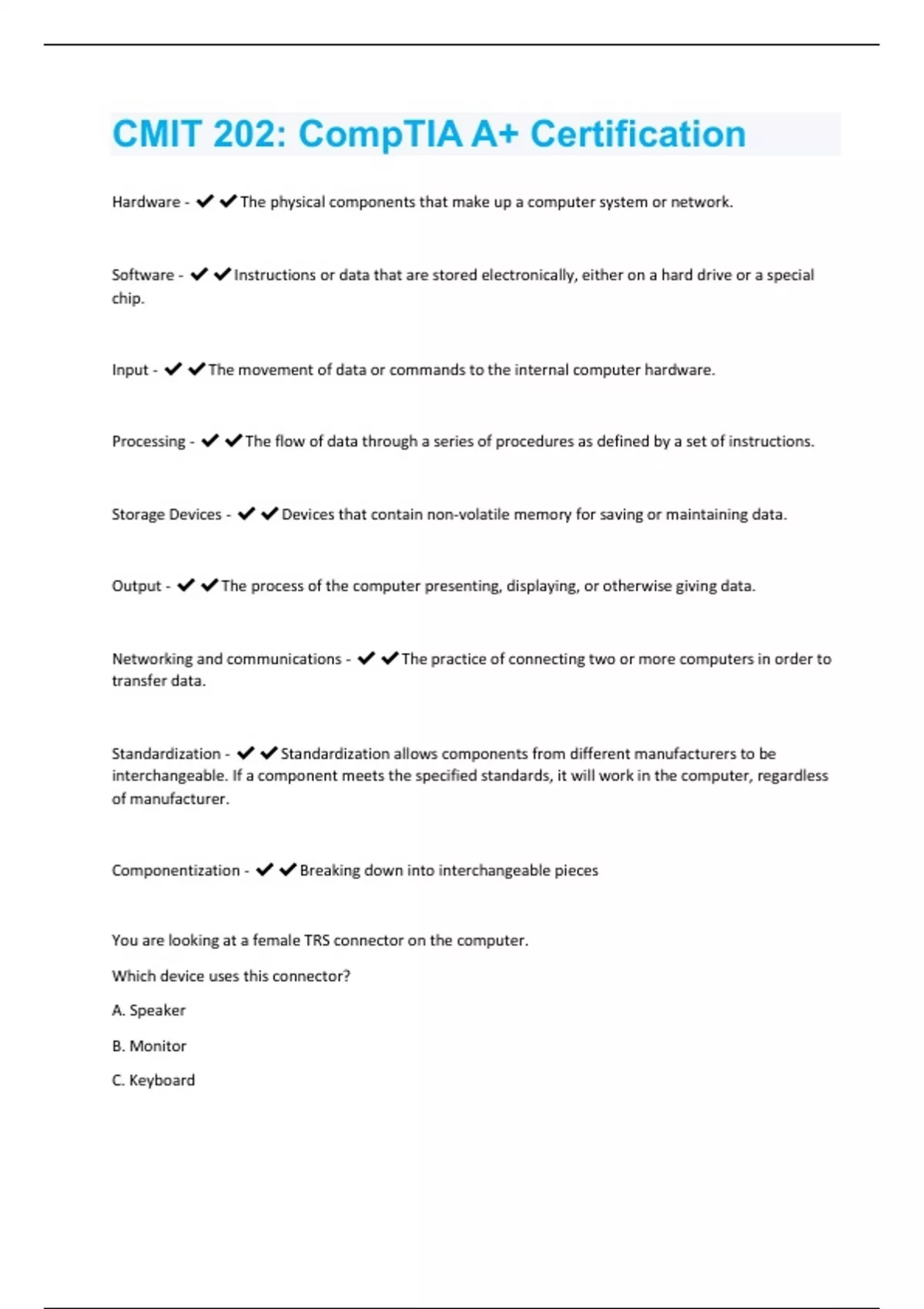 Hardware - The physical components that make up a computer system or network. Software - Instructions or data that are stored electronically, either on a hard drive or a special chip. Input - The movement of data or commands to the internal computer hardware. Processing - The flow of data through a series of procedures as defined by a set of instructions. Storage Devices - Devices that contain non-volatile memory for saving or maintaining data. Output - The process of the computer presenting, displaying, or otherwise giving data. Networking and communications - The practice of connecting two or more computers in order to transfer data. Standardization - Standardization allows components from different manufacturers to be interchangeable. If a component meets the specified standards, it will work in the computer, regardless of manufacturer. Componentization - Breaking down into interchangeable pieces You are looking at a female TRS connector on the computer. Which device uses this connector? A. Speaker B. Monitor C. KeyboardD. JoyStick - A. Speaker You need to replace a broken monitor on a desktop system. You decide to replace it with a spare monitor that wasn't being used. Even though the monitor is made by a different manufacturer than the desktop computer, it still works with the computer. Which computer design concept makes this possible? A. Standardization B. Componentization C. Plug and play D. Firmware - A. Standardization Explanation: Standardization allows components from different manufacturers to be interchangeable. If a component meets the specified standards, it will work in the computer, regardless of manufacturer. You are connecting an older dot matrix printer to a computer. The printer's cable is a D-shaped connector with 25 pins. Which port type does the printer connect to? A. USB port B. Serial port C. VGA port D. Parallel port - D. Parallel Port