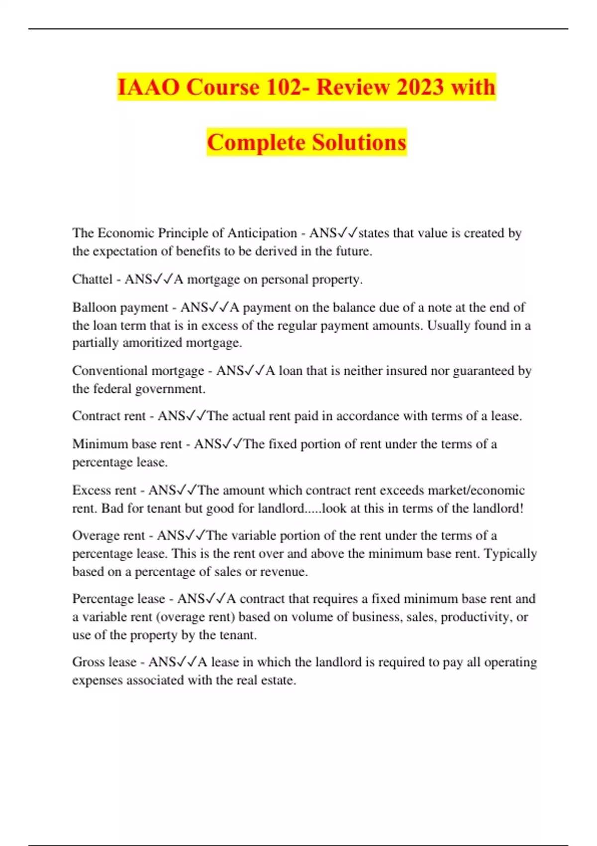 IAAO Course 102- Review 2023 with Complete Solutions The Economic Principle of Anticipation - ANSstates that value is created by the expectation of benefits to be derived in the future. Chattel - ANSA mortgage on personal property. Balloon payment - ANSA payment on the balance due of a note at the end of the loan term that is in excess of the regular payment amounts. Usually found in a partially amoritized mortgage. Conventional mortgage - ANSA loan that is neither insured nor guaranteed by the federal government. Contract rent - ANSThe actual rent paid in accordance with terms of a lease. Minimum base rent - ANSThe fixed portion of rent under the terms of a percentage lease. Excess rent - ANSThe amount which contract rent exceeds market/economic rent. Bad for tenant but good for landlord.....look at this in terms of the landlord! Overage rent - ANSThe variable portion of the rent under the terms of a percentage lease. This is the rent over and above the minimum base rent. Typically based on a percentage of sales or rev
