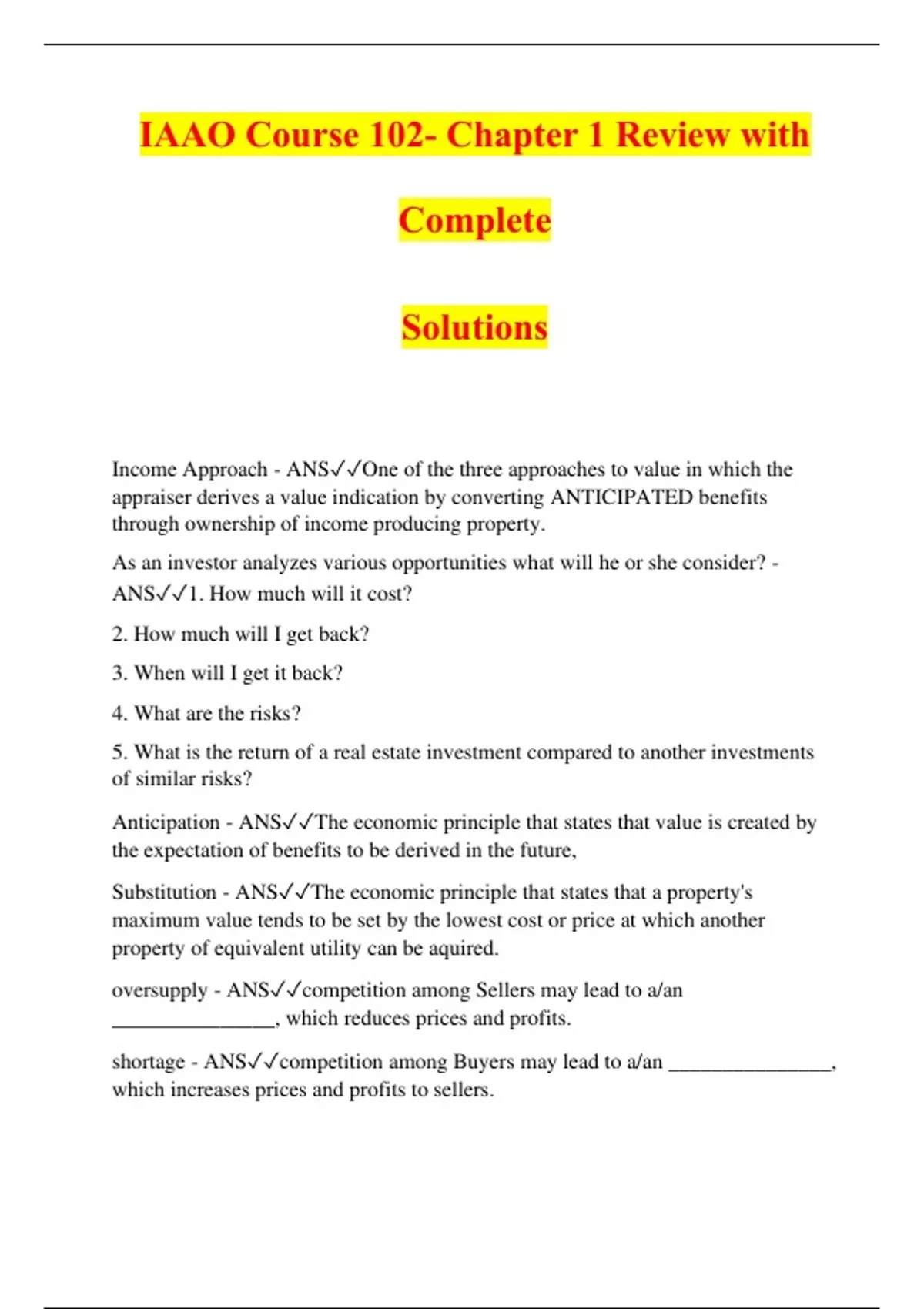 IAAO Course 102- Chapter 1 Review with Complete Solutions Income Approach - ANSOne of the three approaches to value in which the appraiser derives a value indication by converting ANTICIPATED benefits through ownership of income producing property. As an investor analyzes various opportunities what will he or she consider? - ANS1. How much will it cost? 2. How much will I get back? 3. When will I get it back? 4. What are the risks? 5. What is the return of a real estate investment compared to another investments of similar risks? Anticipation - ANSThe economic principle that states that value is created by the expectation of benefits to be derived in the future, Substitution - ANSThe econo