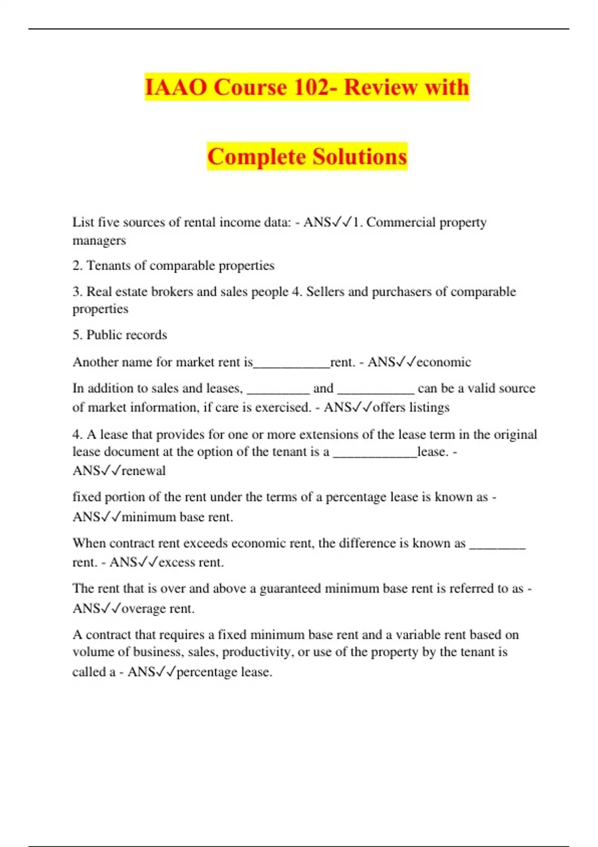 IAAO Course 102- Review with Complete Solutions List five sources of rental income data: - ANS1. Commercial property managers 2. Tenants of comparable properties 3. Real estate brokers and sales people 4. Sellers and purchasers of comparable properties 5. Public records Another name for market rent is___________rent. - ANSeconomic In addition to sales and leases, _________ and ___________ can be a valid source of market information, if care is exercised. - ANSoffers listings 4. A lease that provides for one or more extensions of the lease term in the original lease document at the option of th