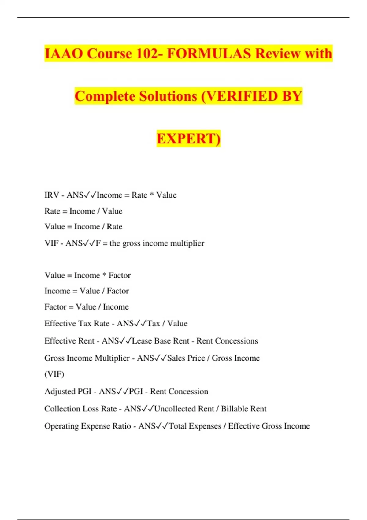 IAAO Course 102- FORMULAS Review with Complete Solutions (VERIFIED BY EXPERT) IRV - ANSIncome = Rate * Value Rate = Income / Value Value = Income / Rate VIF - ANSF = the gross income multiplier Value = Income * Factor Income = Value / Factor Factor = Value / Income Effective Tax Rate - ANSTax / Value Effective Rent - ANSLease Base Rent - Rent Concessions Gross Income Multiplier - ANSSales Price / Gross Income (VIF) Adjusted PGI - ANSPGI - Rent Concession Collection Loss Rate - ANSUncollected Rent / Billable Rent Operating Expense Ratio - ANSTotal Expenses / Effec