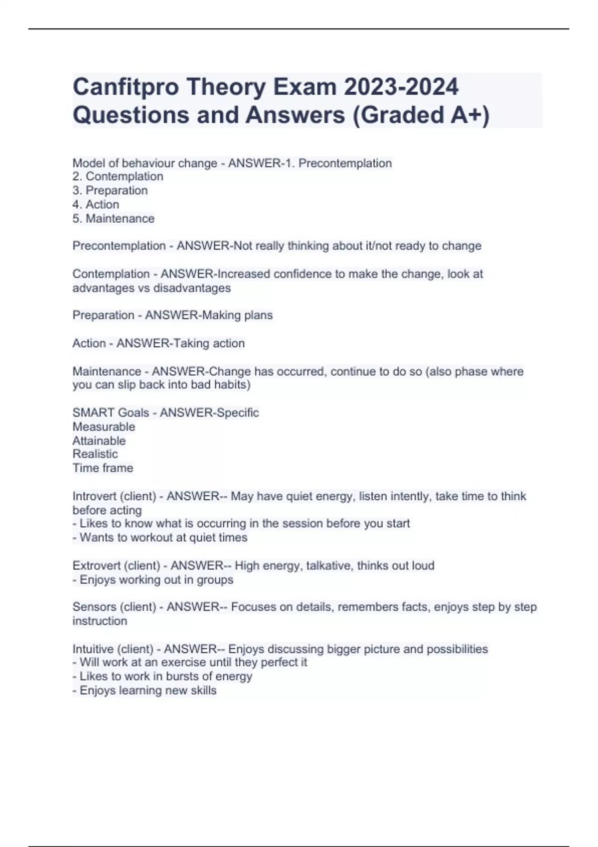Model of behaviour change - ANSWER-1. Precontemplation 2. Contemplation 3. Preparation 4. Action 5. Maintenance Precontemplation - ANSWER-Not really thinking about it/not ready to change Contemplation - ANSWER-Increased confidence to make the change, look at advantages vs disadvantages Preparation - ANSWER-Making plans Action - ANSWER-Taking action Maintenance - ANSWER-Change has occurred, continue to do so (also phase where you can slip back into bad habits) SMART Goals - ANSWER-Specific Measurable Attainable Realistic Time frame Introvert (client) - ANSWER-- May have quiet energy, listen intently, take time to think before acting - Likes to know what is occurring in the session before you start - Wants to workout at quiet times Extrovert (client) - ANSWER-- High energy, talkative, thinks out loud - Enjoys working out in groups Sensors (client) - ANSWER-- Focuses on details, remembers facts, enjoys step by step instruction Intuitive (client) - ANSWER-- Enjoys discussing bigger picture and possibilities - Will work at an exercise until they perfect it - Likes to work in bursts of energy - Enjoys learning new skills Thinker (client) - ANSWER-- Appears cool and reserved and appreciates honest feedback - Likes to know purpose of exercise - Enjoys a healthy debate Feeler (client) - ANSWER-- Makes decisions based off of values and feelings - Motivated by appreciation Judger (client) - ANSWER-- Takes workouts seriously, enjoys a defined start and finish and needs rules and structure Perceiver (client) - ANSWER-- Playful personality, casual, likes to play first and work later Optimal health perspective - ANSWER-Looks at social, physical, mental and emotional health Components of fitness - ANSWER-1. Cardiorespiratory 2. Muscular endurance/strength 3. Flexibility 4. Body composition Body composition - ANSWER-Includes fat free mass (bones, organs, muscle) and fat (visceral and subcutaneous) Secondary components of fitness - ANSWER-- Balance - Coordination - Agility - Reaction time - Speed - Power - Mental capacity Trai