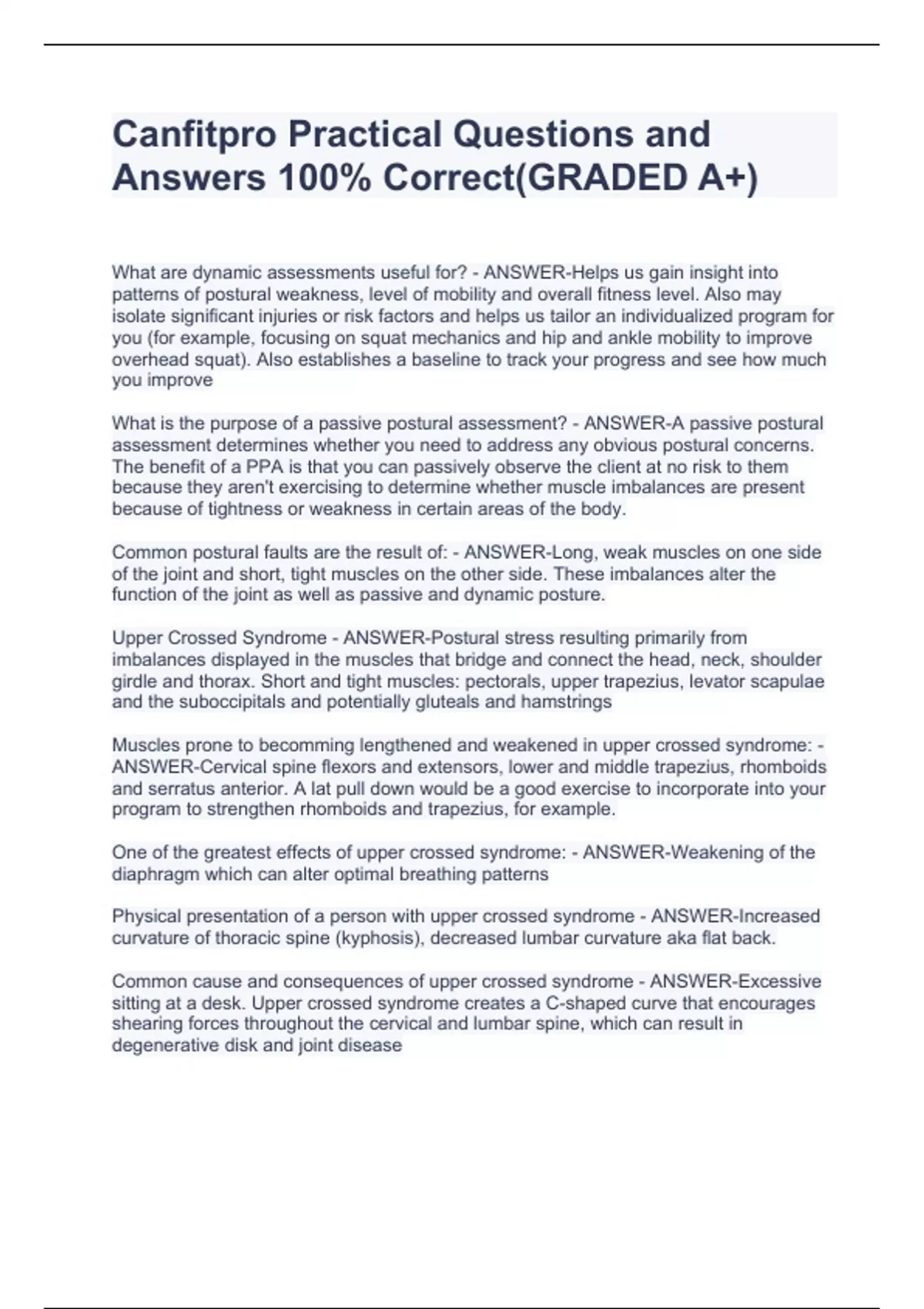 What are dynamic assessments useful for? - ANSWER-Helps us gain insight into patterns of postural weakness, level of mobility and overall fitness level. Also may isolate significant injuries or risk factors and helps us tailor an individualized program for you (for example, focusing on squat mechanics and hip and ankle mobility to improve overhead squat). Also establishes a baseline to track your progress and see how much you improve What is the purpose of a passive postural assessment? - ANSWER-A passive postural assessment determines whether you need to address any obvious postural concerns. The benefit of a PPA is that you can passively observe the client at no risk to them because they aren't exercising to determine whether muscle imbalances are present because of tightness or weakness in certain areas of the body. Common postural faults are the result of: - ANSWER-Long, weak muscles on one side of the joint and short, tight muscles on the other side. These imbalances alter the function of the joint as well as passive and dynamic posture. Upper Crossed Syndrome - ANSWER-Postural stress resulting primarily from imbalances displayed in the muscles that bridge and connect the head, neck, shoulder girdle and thorax. Short and tight muscles: pectorals, upper trapezius, levator scapulae and the suboccipitals and potentially gluteals and hamstrings Muscles prone to becomming lengthened and weakened in upper crossed syndrome: - ANSWER-Cervical spine flexors and extensors, lower and middle trapezius, rhomboids and serratus anterior. A lat pull down would be a good exercise to incorporate into your program to strengthen rhomboids and trapezius, for example. One of the greatest effects of upper crossed syndrome: - ANSWER-Weakening of the diaphragm which can alter optimal breathing patterns Physical presentation of a person with upper crossed syndrome - ANSWER-Increased curvature of thoracic spine (kyphosis), decreased lumbar curvature aka flat back. Common cause and consequences of upper crossed syndrome - ANSWER-Excessive sitting at a desk. Upper crossed syndrome creates a C-shaped curve that encourages shearing forces throughout the cervical and lumbar spine, which can result in degenerative disk and joint disease Lower crossed syndrome is caused by a tightness of _______ and a weakness of _______ - ANSWER-iliopsoas, rectus femoris, lumbar erector spinae. - lower abdominals, gluteals, and hamstrings Physical appearance of lower crossed syndrome - ANSWER-Rounded shoulders and significantly increased curve in lower back (lordosis) Causes and consequences of lower crossed syndrome - ANSWER-Lower crossed syndrome is caused by tightness in the iliopsoas, rectus femoris and lumbar portion of the erector spinae. A consequence is a decreased ability of the lumbo-pelvic complex to stabilize and support weight load placed on the spine which can result in harmful compression and torsion on the low back region. This may be one of the causes of your back pain. To alleviate this, your program will focus on stretching the tight muscles (iliopsoas, rectus femoris, lumbar erectors) and strengthening the weak muscles such as the low abs, glutes and hamstrings Importance of completing a warm-up prior to workout - ANSWER-A warm-up directs blood flow to your working muscles and prepares your body and nervous system for increased activity. A general warm-up serves to elevate your body temperature, and warmer muscles are more efficient muscles. A warm-up that is specific to the type of workout you'll be doing is important to further prepare the body for what's to come. For