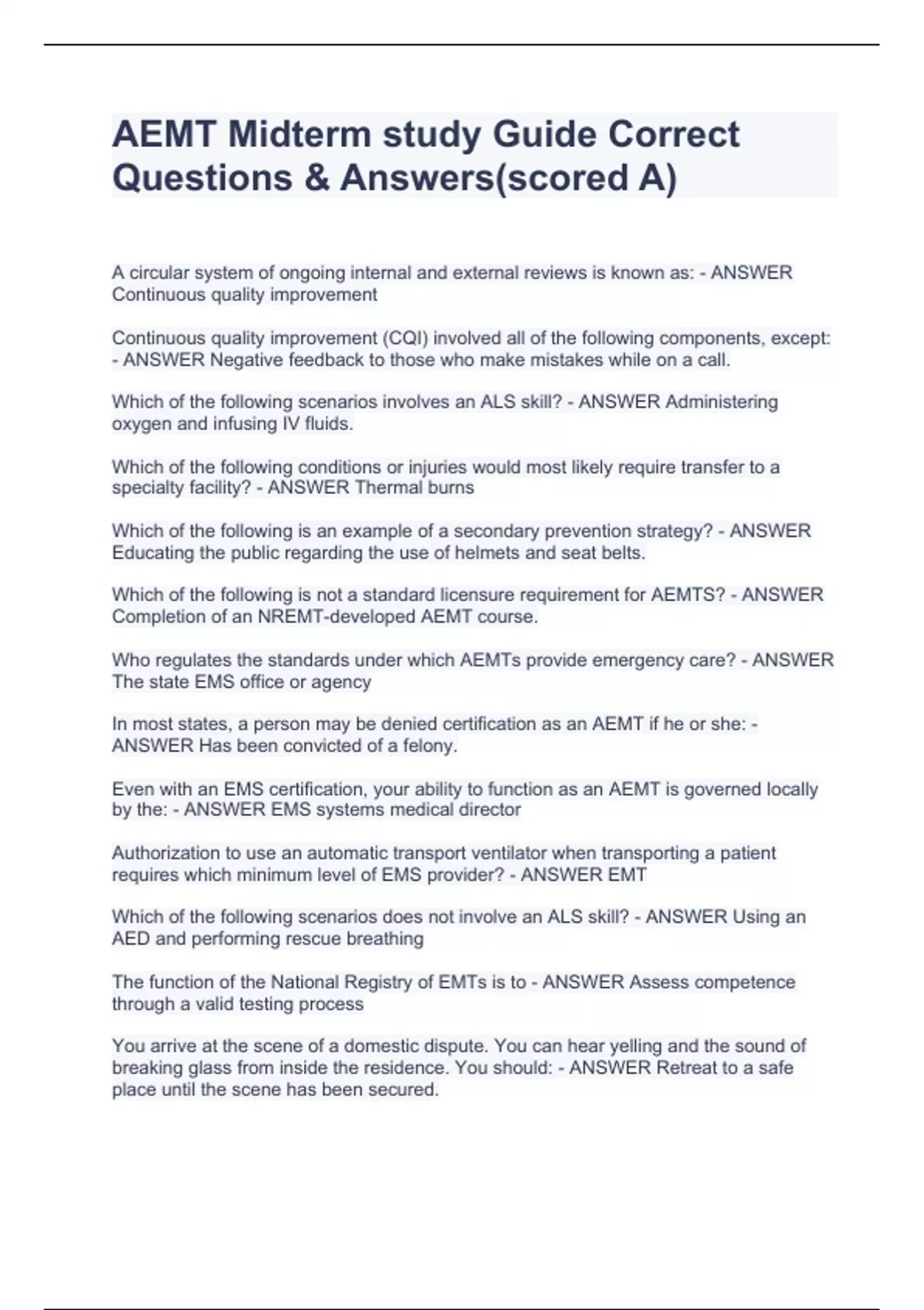 AEMT Midterm study Guide CorAEMT Midterm study Guide Correct Questions & Answers(scored A) A circular system of ongoing internal and external reviews is known as: - ANSWER Continuous quality improvement Continuous quality improvement (CQI) involved all of the following components, except: - ANSWER Negative feedback to those who make mistakes while on a call. Which of the following scenarios involves an ALS skill? - ANSWER Administering oxygen and infusing IV fluids. Which of the following conditions or injuries would most likely require transfer to a specialty facility? - ANSWER Thermal burns Which of the following is an example of a secondary prevention strategy? - ANSWER Educating the public regarding the use of helmets and seat belts. Which of the following is not a standard licensure requirement for AEMTS? - ANSWER Completion of an NREMT-developed AEMT course. Who regulates the standards under which AEMTs provide emergency care? - ANSWER The state EMS office or agency In most states, a person may be denied certification as an AEMT if he or she: - ANSWER Has been convicted of a felony. Even with an EMS certification, your ability to function as an AEMT is governed locally by the: - ANSWER EMS systems medical director Authorization to use an automatic transport ventilator when transporting a patient requires which minimum level of EMS provider? - ANSWER EMT Which of the following scenarios does not involve an ALS skill? - ANSWER Using an AED and performing rescue breathing The function of the National Registry of EMTs is to - ANSWER Assess competence through a valid testing process You arrive at the scene of a domestic dispute. You can hear yelling and the sound of breaking glass from inside the residence. You should: - ANSWER Retreat to a safe place until the scene has been secured. To become a licensed AEMT, a candidate miust: - ANSWER Successfully complete a healthcare provider CPR course. rect Questions & Answers(scored A)
