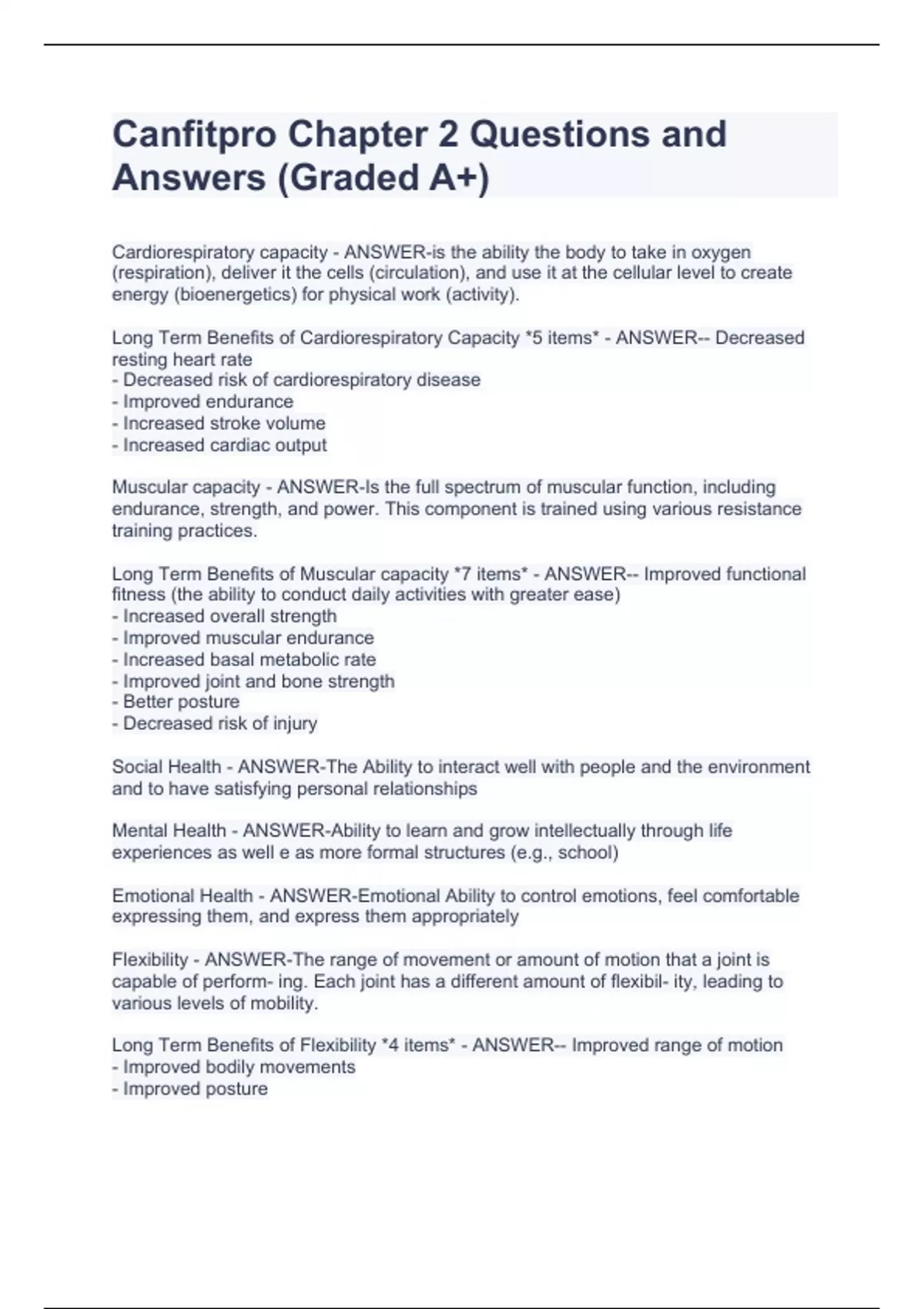 Cardiorespiratory capacity - ANSWER-is the ability the body to take in oxygen (respiration), deliver it the cells (circulation), and use it at the cellular level to create energy (bioenergetics) for physical work (activity). Long Term Benefits of Cardiorespiratory Capacity *5 items* - ANSWER-- Decreased resting heart rate - Decreased risk of cardiorespiratory disease - Improved endurance - Increased stroke volume - Increased cardiac output Muscular capacity - ANSWER-Is the full spectrum of muscular function, including endurance, strength, and power. This component is trained using various resistance training practices. Long Term Benefits of Muscular capacity *7 items* - ANSWER-- Improved functional fitness (the ability to conduct daily activities with greater ease) - Increased overall strength - Improved muscular endurance - Increased basal metabolic rate - Improved joint and bone strength - Better posture - Decreased risk of injury Social Health - ANSWER-The Ability to interact well with people and the environment and to have satisfying personal relationships Mental Health - ANSWER-Ability to learn and grow intellectually through life experiences as well e as more formal structures (e.g., school) Emotional Health - ANSWER-Emotional Ability to control emotions, feel comfortable expressing them, and express them appropriately Flexibility - ANSWER-The range of movement or amount of motion that a joint is capable of perform- ing. Each joint has a different amount of flexibil- ity, leading to various levels of mobility. Long Term Benefits of Flexibility *4 items* - ANSWER-- Improved range of motion - Improved bodily movements - Improved posture - Decreased risk of injury Body composition - ANSWER-Is the proportion of fat free mass (i.e., muscle, bone, blood, organs, and fluids) to fat mass (adipose tissue deposited under the skin and around organs) Long Term Benefits of Body composition *5 items* - ANSWER-- Decreased risk of cardiorespiratory disease - Improved basal metabolic rate - Improved bodily function - Improved body mass index (BMI) - Higher overall self-confidence Secondary Components Fitness *7 items* - ANSWER-1. Balance 2. Coordination 3. Agility 4. Reaction Time 5. Speed 6. Pow